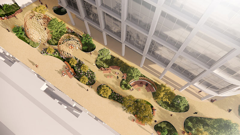 Ispirato alle forme della natura e in particolare ai fasci di legno pregiato presenti nei boschi, il design dei tre padiglioni di Regent's Place raccoglie sottili strisce di quercia in delicati reticoli, invitando i passanti a una sosta dal caos della città, immersa in una lussureggiante e inaspettata vegetazione.