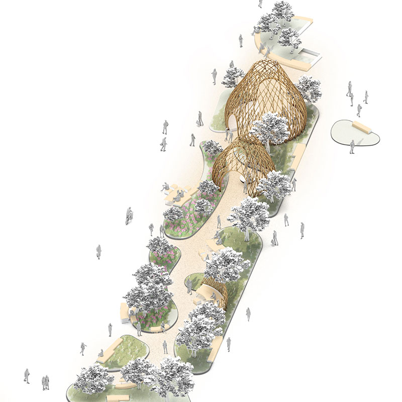 Di forma arrotondata, i due padiglioni più grandi hanno un oculo centrale che attira l'attenzione delle persone invitando a guardare verso il cielo. Da ovest verso est, invece, i padiglioni aumentano di dimensioni: il primo costruisce dei piccoli salotti urbani per la chiacchiera, la seconda invita grandi e piccini a giocare con un grande seggiolino circolare girevole posizionato al centro del percorso.