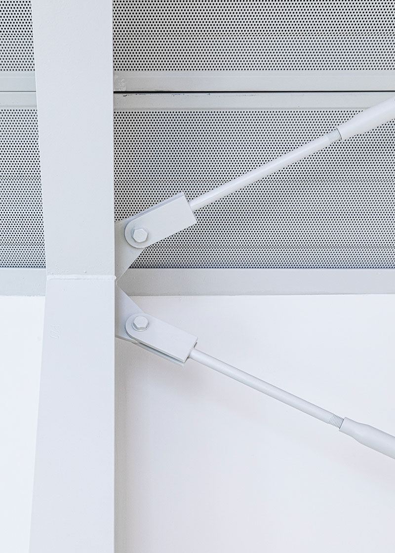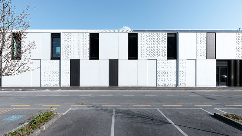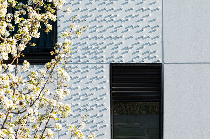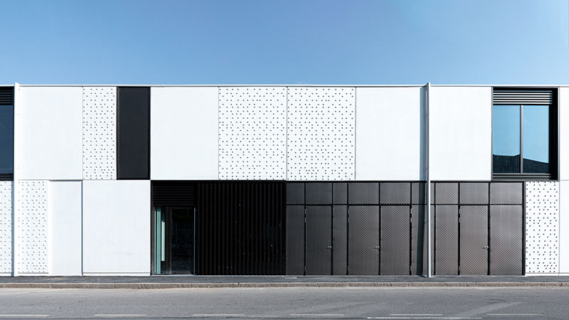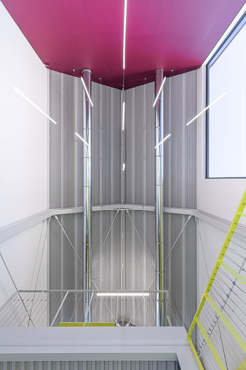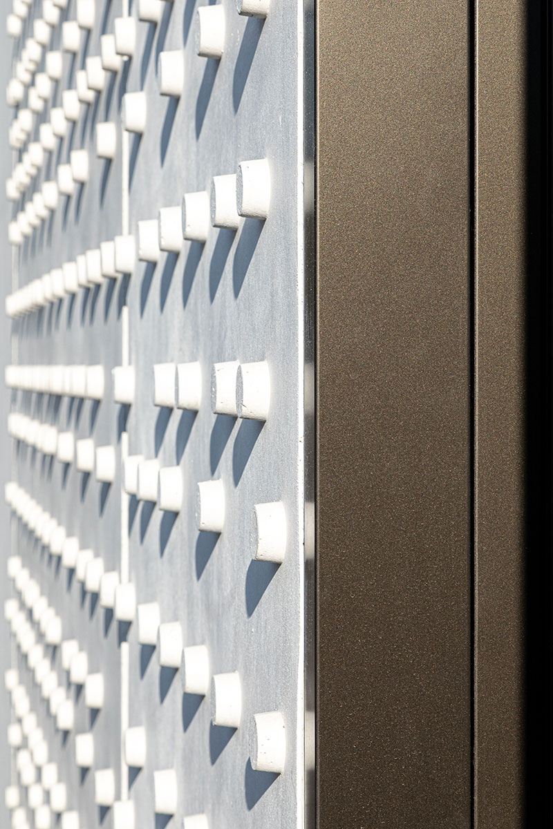 I serramenti, invece, portati in evidenza da sottili imbotti, creano un gioco di ombre con i pannelli di facciata, completati da rivestimenti in lamiera grecata brunita che contribuiscono a ridurre l'effetto dei dislivelli interni del solaio intermedio e della copertura.