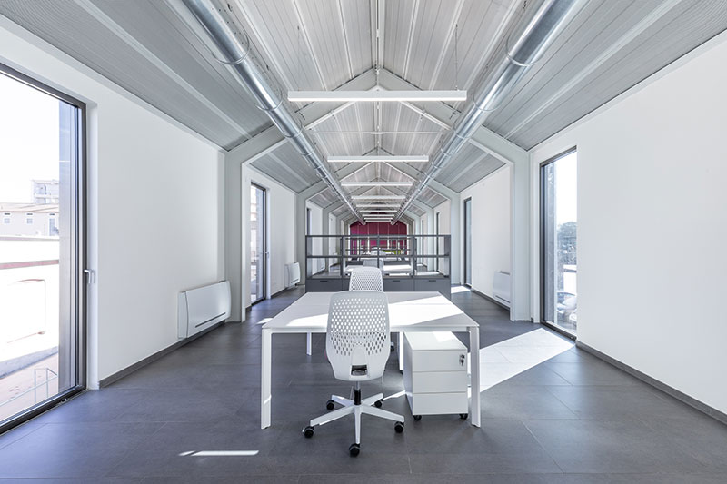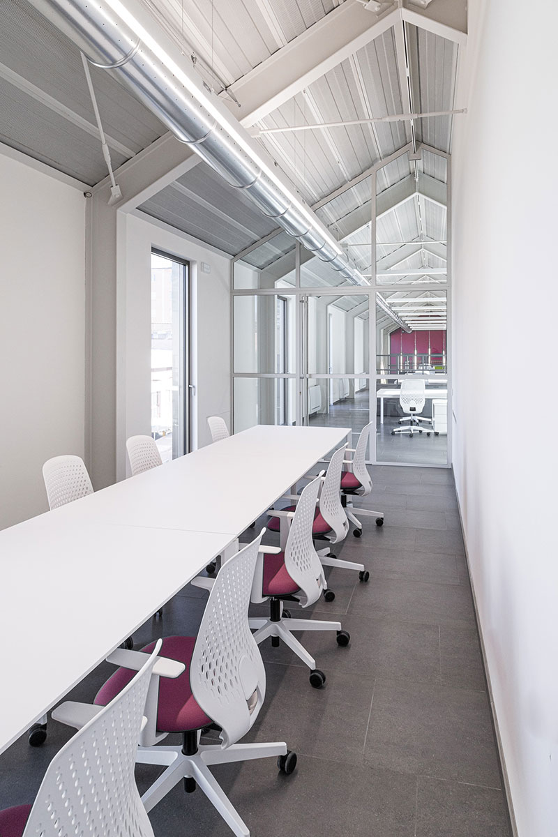Coerentemente con il carattere estetico dell'esterno, anche gli interni, destinati ad ufficio, si ispirano al concetto minimalista, con gli impianti lasciati a vista per conservare il carattere industriale del complesso e il colore bianco delle pareti pareti in contrasto con i pavimenti e i serramenti scuri, esaltati dalla presenza di dettagli dalle cromie accese.