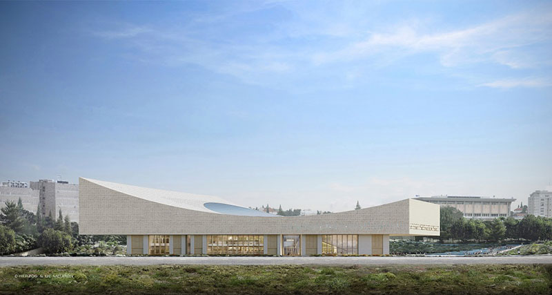La maestosa nuova Biblioteca nazionale di Israele, progettata dagli svizzeri Herzog & de Meuron, vincitori del Pritzker 2001, si estende su di un'area di 45.000 mq circondata da giardini e piazze. Situata tra la Knesset e il Museo di Israele a Gerusalemme, il nuovo edificio e il campus sono una manifestazione della visione di apertura e accessibilità che incoraggia e accoglie il pubblico da Israele e da tutto il mondo a interagire con i tesori inestimabili della Biblioteca. La Sala di Lettura Principale, di circa 4.700 mq è il fulcro del nuovo edificio: costruito su tre livelli ospita le collezioni principali della Biblioteca Nazionale, Giudaica, Israele, Islam e Medio Oriente, Studi umanistici. E se a Pechino con Snøhetta la biblioteca assumeva la metafora della foresta, qui la caratteristica distintiva è il "mare di libri", grazie ad un' architettura che se all'esterno si fa monolitica, all'interno da invece libero flusso di movimento senza separazione fisica tra le diverse aree di raccolta.