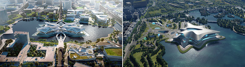 Hanno diversi punti in comune i due progetti che lo studio Zaha Hadid Architects aprirà nel corso del 2023. Entrambi sono in Cina. Entrambi sono pensati come "penisole", grandi volumi organici galleggianti che sembrano fluttuare sopra la superficie dell'acqua (di lago). Entrambi poi, sono musei: lo Zhuhai Jinwan Civic Art Center (img a sinistra) e il Chengdu Science Fiction Museum (img a destra).