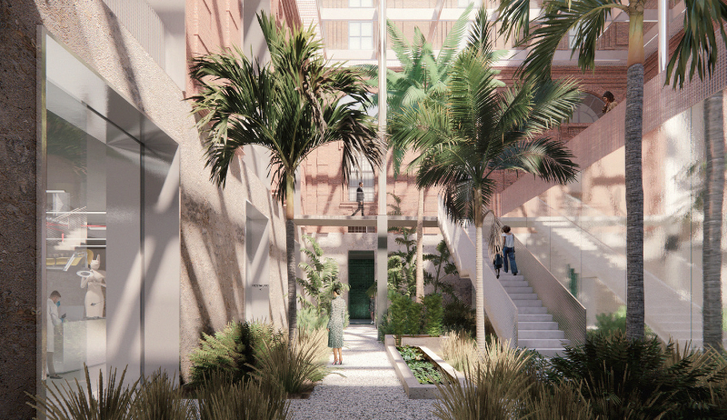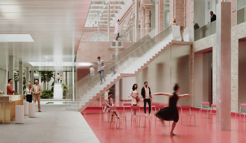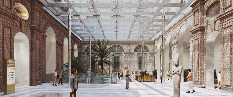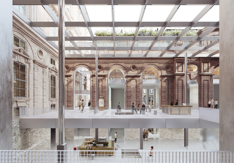 Le molteplici aperture storiche al livello zero del cortile - che erano state chiuse in seguito ad alcuni interventi - vengono nuovamente aperte, ricollegando lo spazio pubblico alla città. Al livello -1 si trovano il Giardino Egizio e lo spazio per eventi e apprendimento. Qui viene scoperta la facciata originale del Collegio dei Nobili nascosta dalla ristrutturazione del 2010. Sopra il cortile è prevista una tettoia trasparente. La sua griglia strutturale in acciaio rivestita in alluminio è un dispositivo per la raccolta dell'acqua piovana, la ventilazione dell'aria e la fornitura di illuminazione.