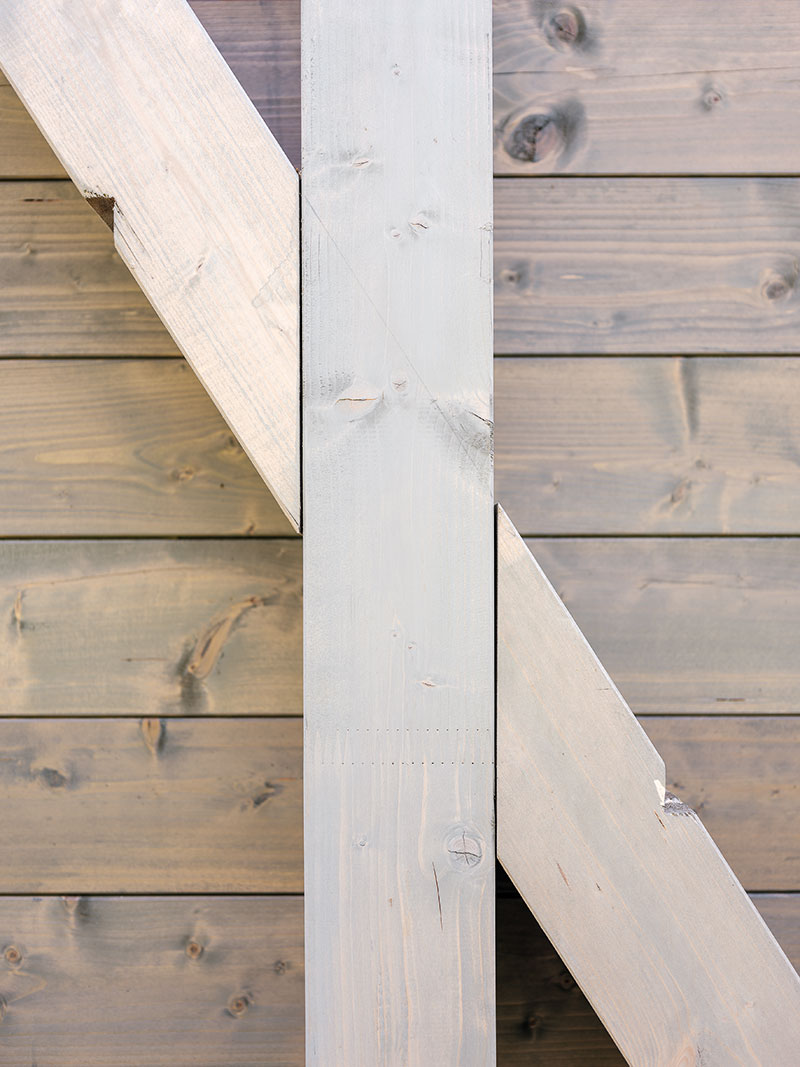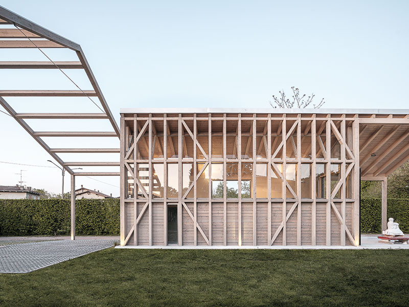 Il legno, assemblato, diventa quindi assoluto protagonista, in un gioco geometrico di facciata che a volte si infittisce, altre lascia spazio al vetro, o addirittura si svuota completamente assumendo la funzione di cornice per incanalare la vista sulle prospettive dell'intorno.