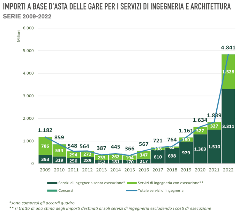 Limitando l'osservazione alle gare per servizi di ingegneria "tipici" (escludendo dunque accordi quadro, bandi con esecuzione dei lavori, concorsi di idee e progettazione, bandi per servizi Ict), aumenta notevolmente l'importo complessivo a base d'asta loro destinato arrivando a sfiorare il miliardo e mezzo di euro (massimo storico registrato finora) contro gli 806 milioni rilevati nel 2021.