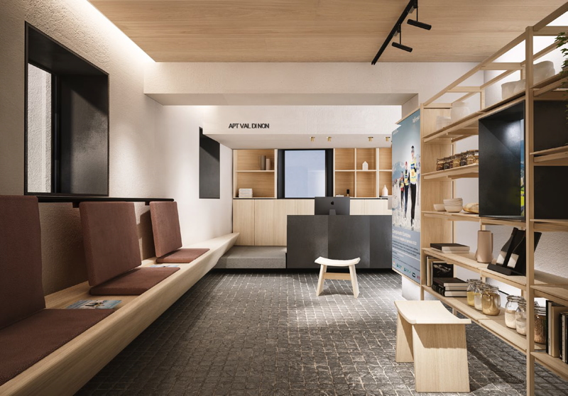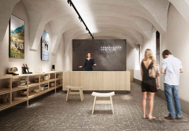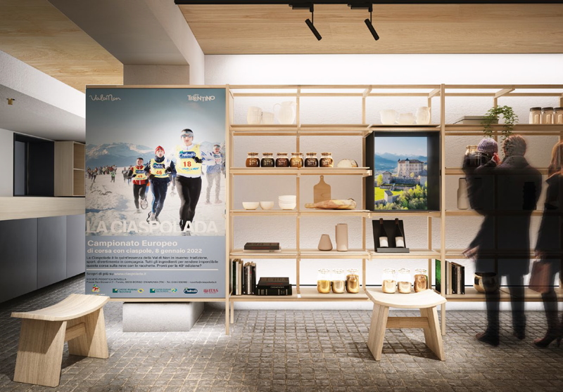 Solo poche e puntuali modifiche per il sistema distributivo, il progetto si concentra sull'allestimento e le finiture degli spazi interni. «Molta importanza - scrivono i progettisti - è stata data all'uniformità di linguaggio, considerata la chiave per realizzare degli ambienti con un'identità visiva chiara e riconoscibile. Il visitatore che entrerà nel centro rinnovato leggerà un insieme unitario di funzioni, tra le quali si orienterà con facilità, conoscendo senza sforzo le opportunità date dalla Val di Non».