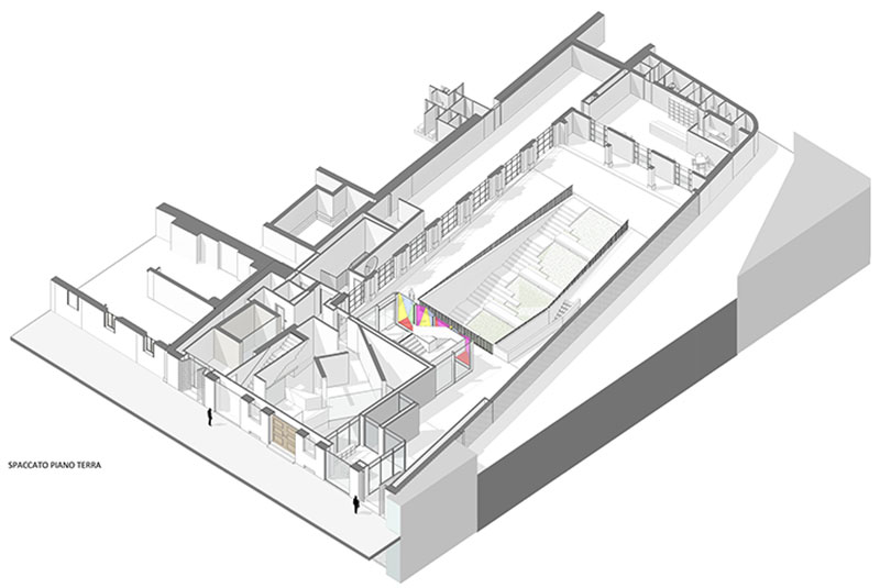 Il progetto di recupero, articolato e differenziato nel massimo rispetto della valenza storica espressa nelle diverse fasi costruttive, sviluppa l'intervento su tre livelli attorno al grande vuoto del cortile centrale, concepito come una cavea per raggiungere la quota del piano seminterrato: qui troveranno spazio i laboratori destinati alle attività di divulgazione, formazione, documentazione e sperimentazione.