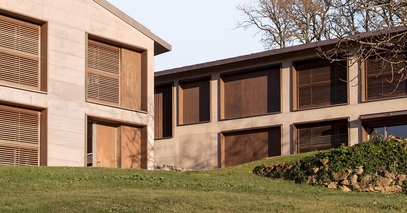 Nel pieno rispetto della sostenibilità ambientale e della tutela delle risorse del territorio, il progetto mantiene le volumetrie esistenti, esaltando l'aspetto brutalista del cemento non rifinito attraverso il gioco di contrasto innescato dall'eleganza delle finiture, come quelle del sotto gronda e del soffitto della veranda in cedro ossidato e i dettagli di scale, parapetti e veranda in acciaio verniciato.