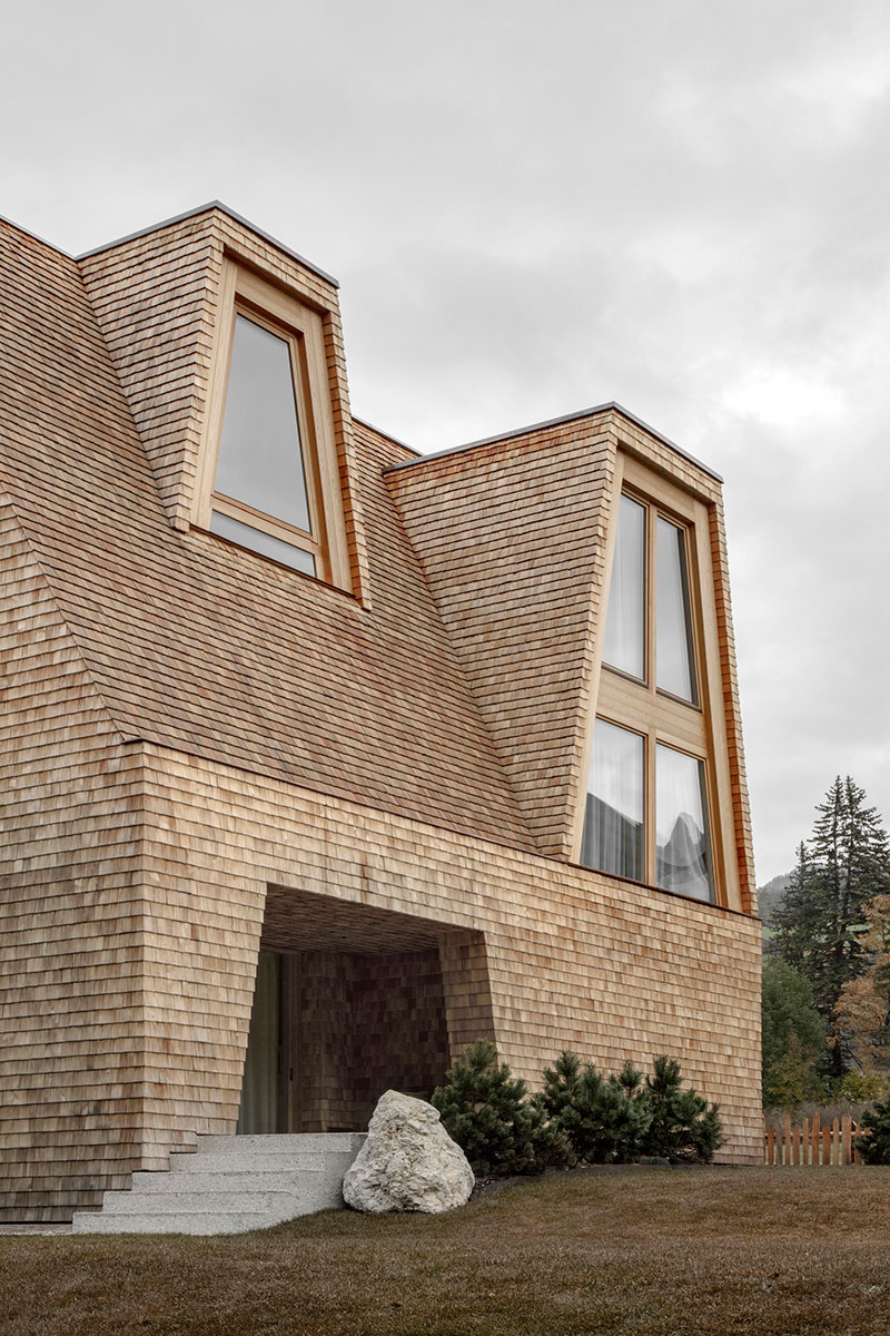 La caratteristica facciata mostra un rivestimento in scandole di larice tagliate a mano, mentre il cemento per il seminterrato è costituito da roccia dolomitica proveniente dal torrente di passaggio, arricchita con l'acqua termale della casa.
