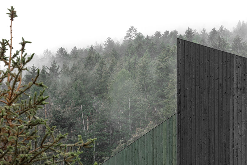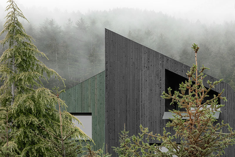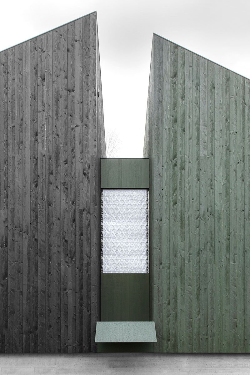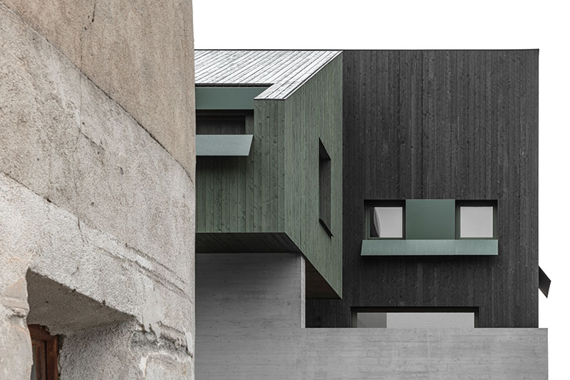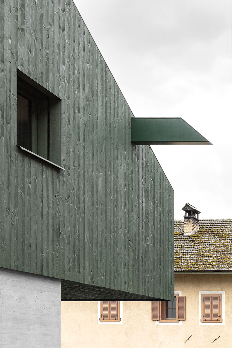 La forma del tetto a spiovente, oltre a riprendere i caratteri del luogo, gioca sul movimento, tra sporgenze e rientranze, dando luogo a un effetto di ombra ulteriormente accentuata dalla scelta della colorazione del legno.
