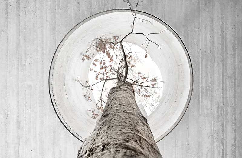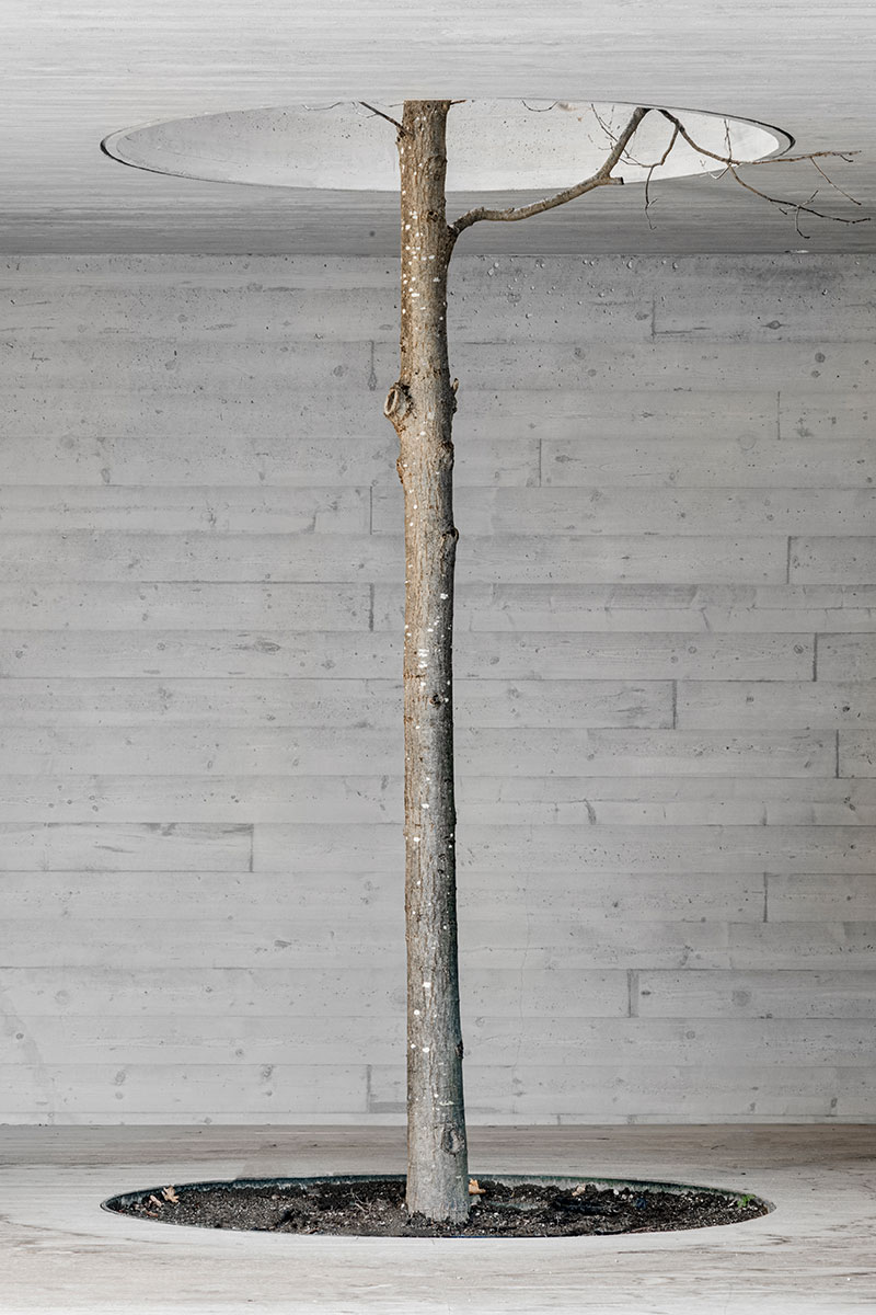 Nel complesso la struttura sembra divisa in due parti e, nell'estensione verticale, l'edificio in legno forma uno spazio peculiare sia dal punto di vista strutturale che architettonico, ricavando lo spazio per la crescita di un albero, come fosse un pilastro.