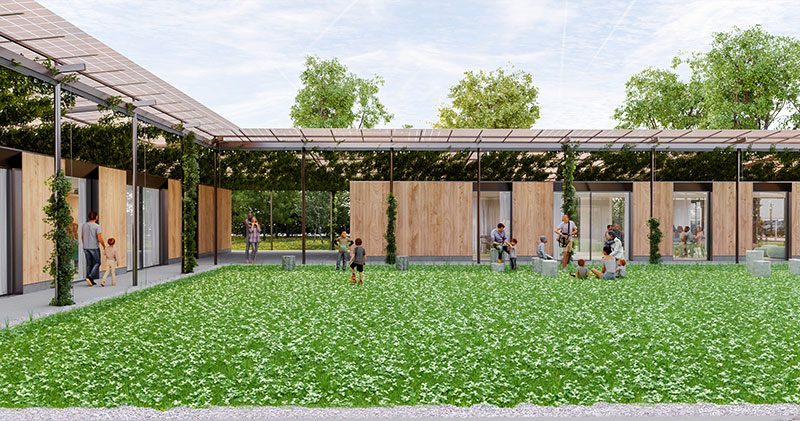 La grande piazza, in continua relazione con il costruito grazie al lungo porticato, sarà infatti adatta ad ospitare eventi e feste anche in condizioni di pioggia o sole eccessivo.