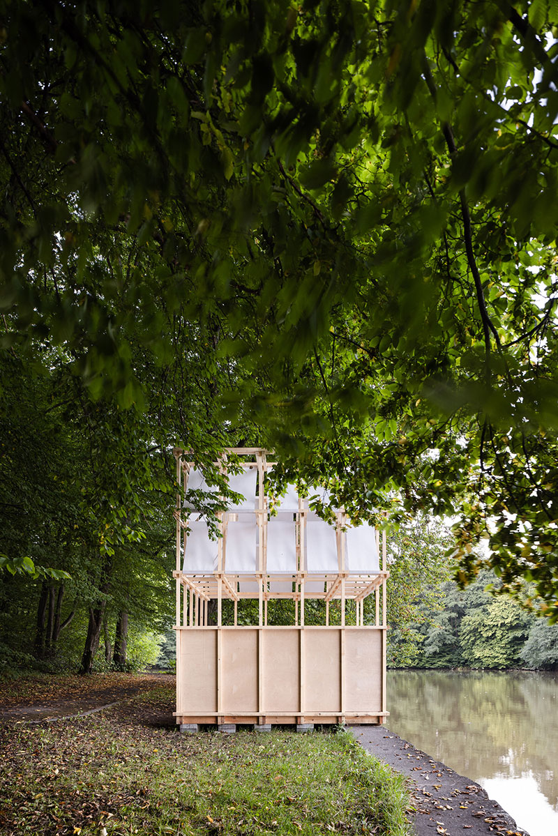 La stessa cura certosina e la simbologia di questo rito è riportata nel piccolo padiglione immerso nel contesto naturale del lago Hrabinka progettato da GRAU Architects insieme agli studenti durante un workshop di autocostruzione. Qui vista, suono e movimento invitano le persone a prendere una pausa dalla frenesia del quotidiano, a fermarsi per prestare attenzione alle cime degli alberi e alla quiete dell'acqua.