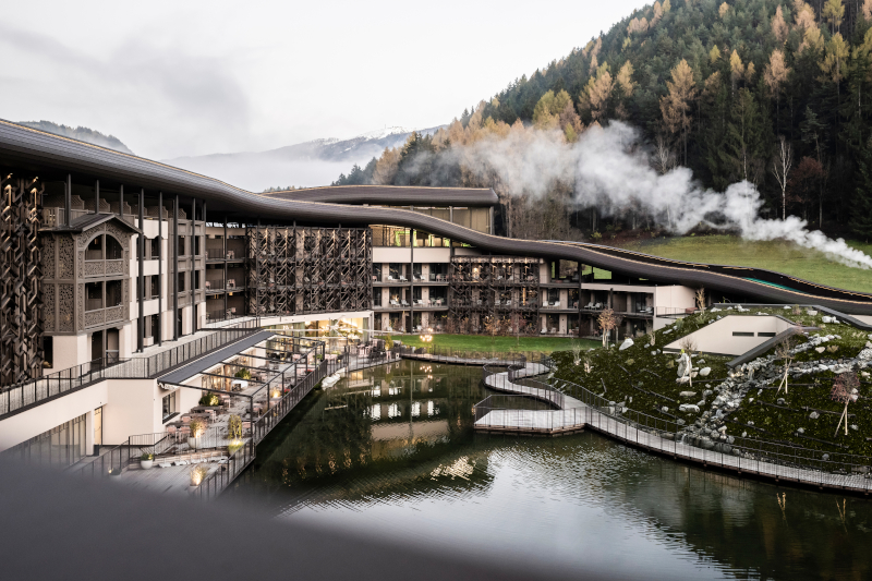 I pattern geometrici in legno naturale presenti in facciata evocano i vecchi fienili alpini. «Anche il rapporto tra il resort e il piccolo lago su cui si affaccia è stato "ridisegnato", con la creazione di una collina artificiale lungo una riva, sotto la quale trova spazio la spa per adulti. Una nuova ampia terrazza si apre sul fronte lago e la piscina, in parte coperta, si prolunga a sfioro sullo specchio d'acqua», si legge ancora nella nota.