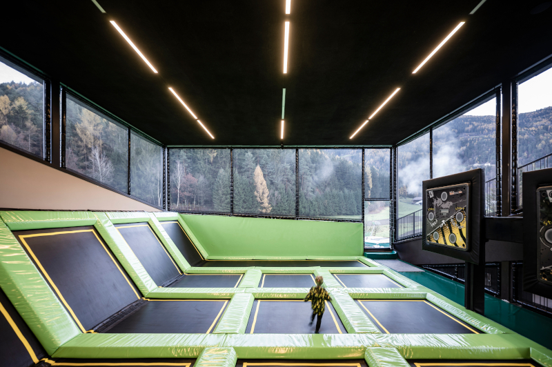 «Il fondo artificiale - spiegano allo studio noa* -, ne consente l'uso tutto l'anno, come succede anche con la pista di pattinaggio, che si trova nel punto più alto della copertura. Sull'altro versante, affacciato ad ovest, si collocano un'ampia zona fitness per tutta la famiglia, una pista bobby car e un mini parco avventure sopraelevato, sotto il quale trova spazio un campo per calcio, basket e altre attività. Qui, un acquascivolo lungo 120 metri, si snoda sopra il lago fino a raggiungere un'area del piano interrato occupata da altri spazi-gioco e dalla piscina: con le sue spirali color giallo acceso, lo scivolo si staglia sul paesaggio e diventa il simbolo di una struttura tutta dedicata allo svago e all'avventura dei suoi piccoli ospiti».