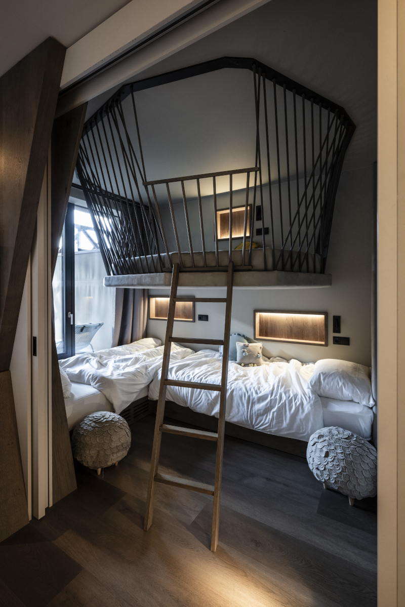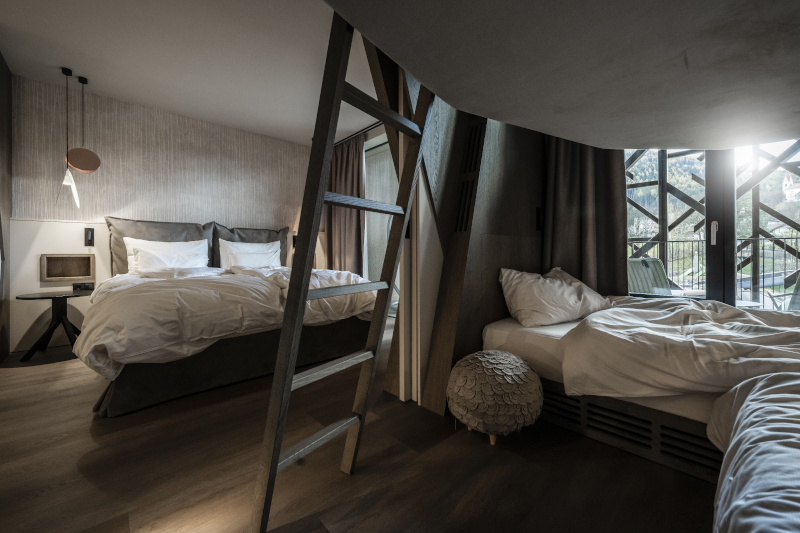 Sono state inoltre aggiunte 36 nuove camere alle 82 esistenti. Le camere comprendono una zona per i genitori e una zona per i figli, tra loro separate da un divisorio scorrevole. «Nell'area-bambini sono sempre disponibili tre letti, uno dei quali, sospeso al soffitto, è una sorta di letto-nido, ispirato al falco, che è il simbolo dell'hotel, e anche quando non è occupato diventa sempre occasione di gioco e di divertimento per i più piccoli», conclude Caterina Betti, interior architect dello studio altoatesino.