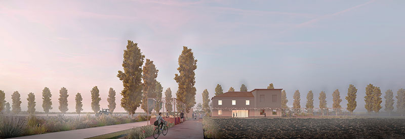Come un lavoro nel paesaggio e con il paesaggio, quindi, il progetto parte dal macro-sistema e disegna un percorso di 1 Km destinato alla mobilità leggera, realizzato in terreno stabilizzato, affiancato da un canale di irrigazione e da alberature, con momenti di pausa costituiti da elementi puntuali, sottoforma di micro presidi con funzione informativa, supporto alle attività e integrazione di componenti impiantistiche, unite dalla volontà di far leggere il paesaggio in forma nuova.