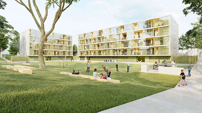 Il progetto di QB Atelier colloca gli edifici sul margine del lotto, assegnando al verde lo spazio centrale per definire un ambiente protetto e delle quinte paesaggistiche in grado di valorizzare le visuali prospettiche dall'interno degli alloggi.