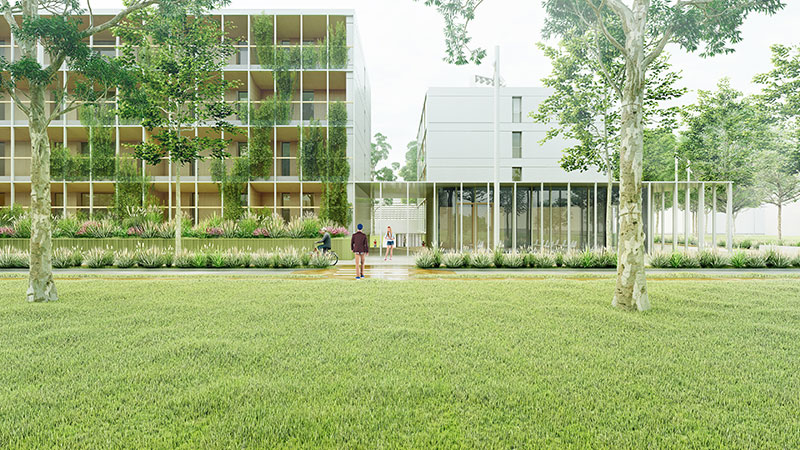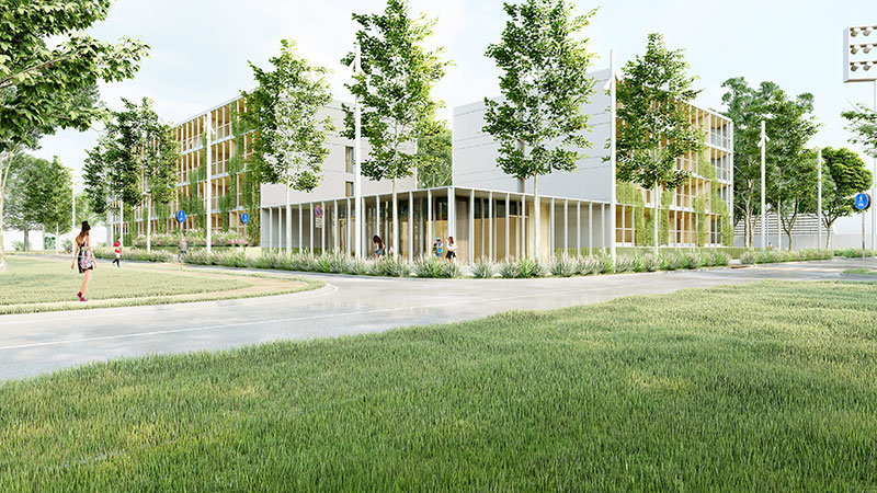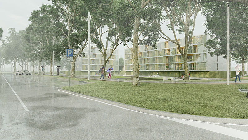 Ne deriva una "corte aperta", costituita su due lati dai volumi residenziali e lungo gli altri da un doppio filare di alberi, con un margine permeabile e un ambiente adatto alla socializzazione in un contesto di trasformazione.