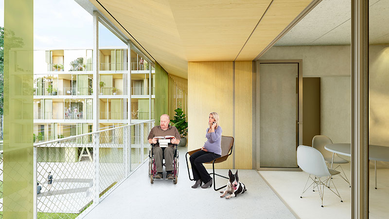 I volumi dei piani residenziali - semplici e ben armonizzati nel contesto - poggiano su un basamento di servizio destinato ai posti auto e alle cantine, con i fronti aperti verso il nuovo paesaggio caratterizzati da logge racchiuse da vetrate per garantire "la camera aggiunta indefinita" ad ogni abitazione, uno spazio flessibile che si trasforma in giardino d'inverno durante i mesi più freddi e protezione solare durante l'estate, donando al complesso un'estetica dinamica di facciata.