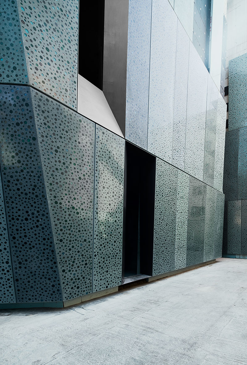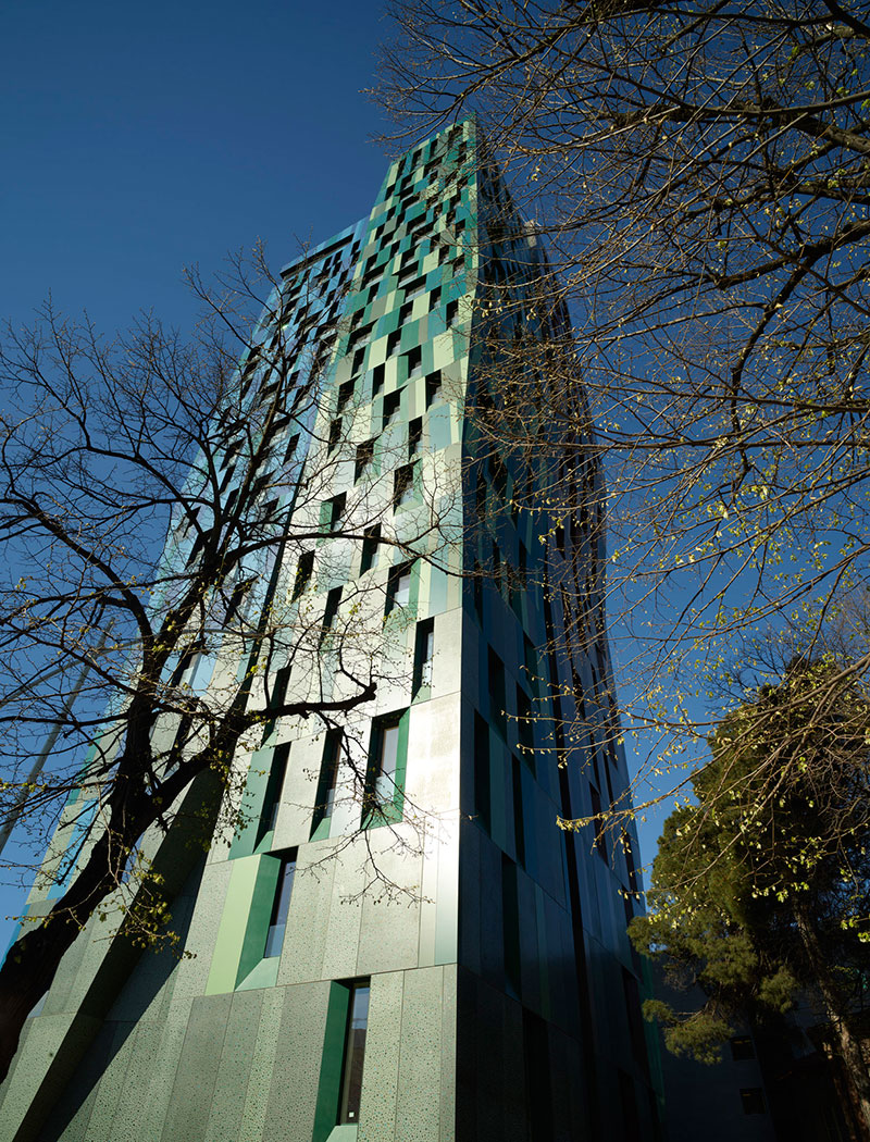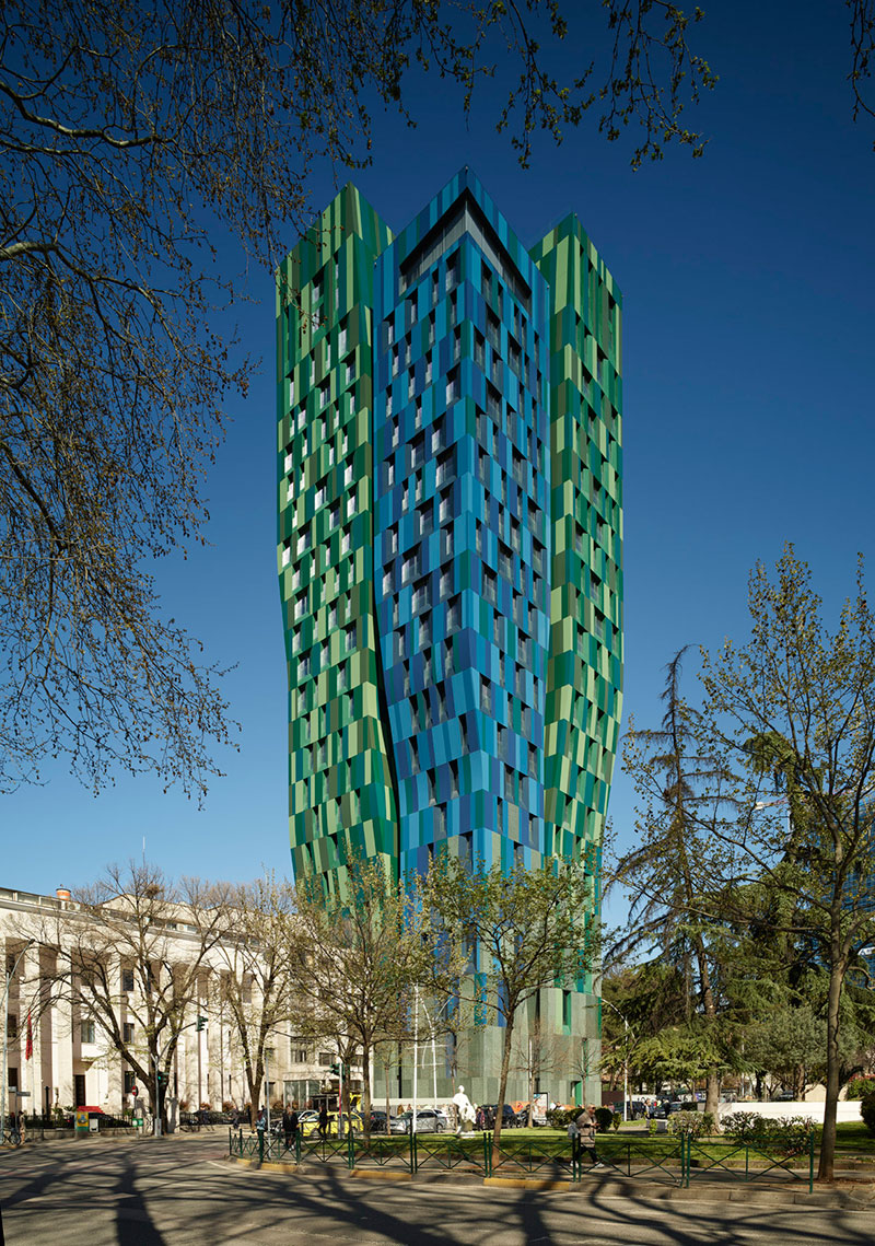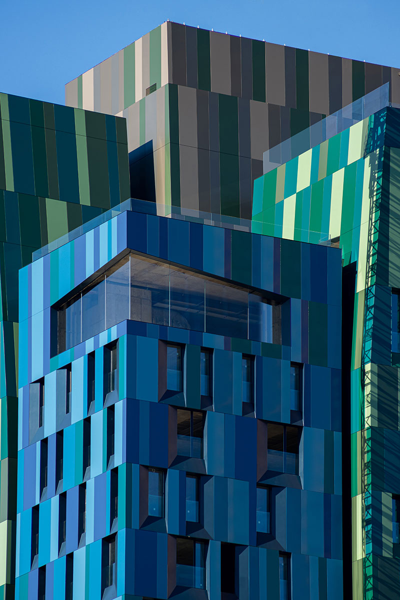 Un altro rimando alla metafora dell'albero è rappresentato dalla cromia di facciata, dove la parte basamentale (il tronco) è realizzata in solidi pannelli di calcestruzzo pigmentato di colore verde con l'inserimento di piccole gemme circolari di vetro di murano di cinque colori diversi. Levigati e lucidati, i pannelli degradano poi verso l'alto, lasciando posto ad elementi più leggeri in alluminio di 13 tonalità differenti, che si aprono e si curvano come fossero rami e foglie.