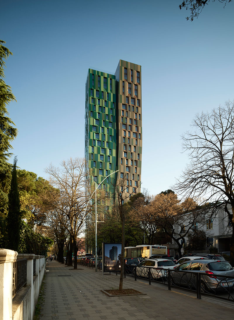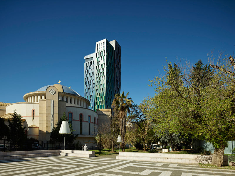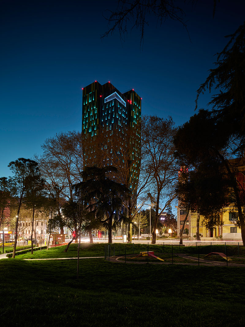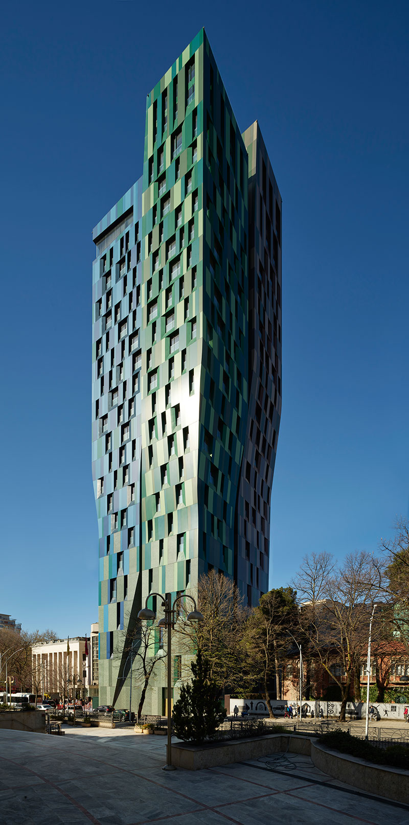 A firmare l'edificio - parte di un complesso programma di rinnovamento dell'intero centro storico della città di Tirana, disegnato e ideato tra il 1920 e il 1935 dagli architetti italiani Armando Brasini e Gherardo Bosio - è lo studio fiorentino Archea associati che riuscì a conquistare positivamente la giuria per l'innovatività della proposta. L'idea si basava sulla volontà di superare la concezione americana del grattacielo richiamando, al tempo stesso, il profilo di celebri torri italiane come il Palazzo della Signoria di Firenze o la Torre Velasca realizzata nel secondo dopoguerra a Milano. Un'innovazione non solo estetica, ma anche tecnologica e strutturale, che ha visto la torre resistere al terremoto del 2019.