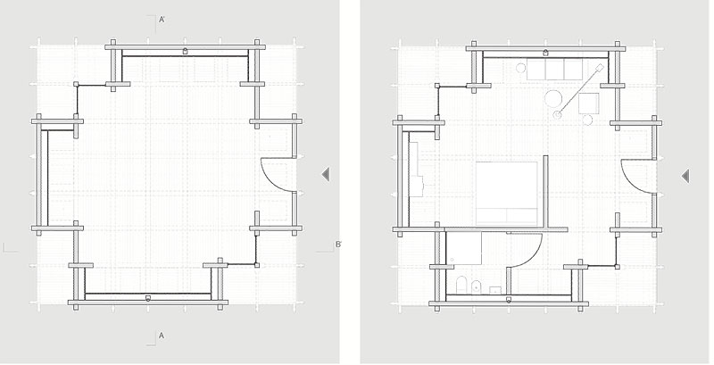 La logica costruttiva è dettata dalla modularità e versatilità dello spazio, per una superficie di 12 mq con struttura portante costituita da setti in legno bi-lamellare, assemblata con sistema ad incastro Blockhaus. Tecnicamente ridotti al minimo indispensabile per garantire stabilità e predisposizione impiantistica, i setti disegnano quattro ampi portali che assicurano il costante ingresso della luce, protagonista assoluta dell'intero progetto.