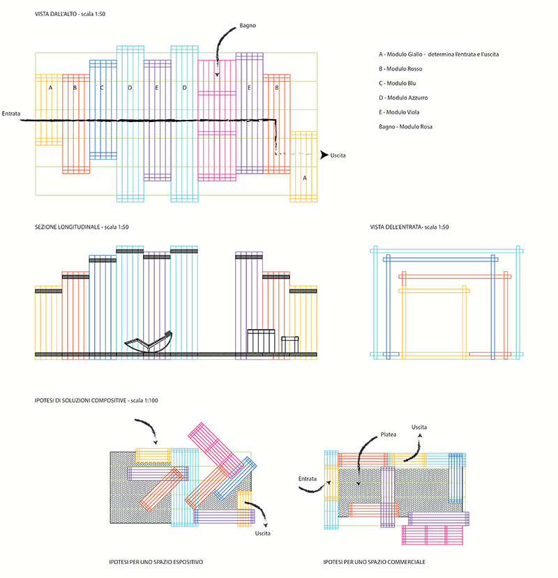 Il risultato è la definizione di più moduli, di dimensioni differenti, accostabili, incrociabili, capaci di definire differenti spazi in relazione alla necessità, liberi da uno schema compositivo, se non per il basamento a cui vanno fissati.