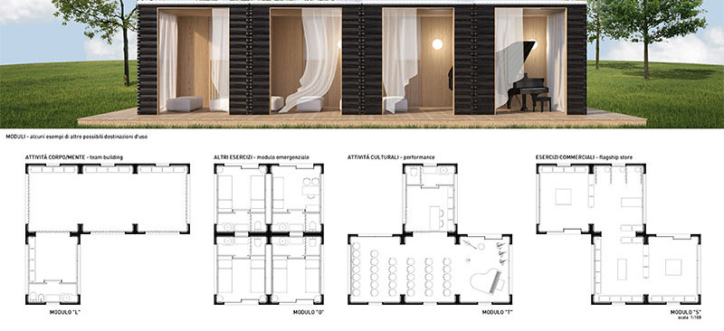 Il modulo, così replicabile ai suoi lati, crea spazi di varie metrature, con la possibilità di realizzare composizioni differenti, proprio come un palcoscenico minimo che offre a chi lo abita accoglienza, intrattenimento, educazione, aiuto e, soprattutto, ascolto.