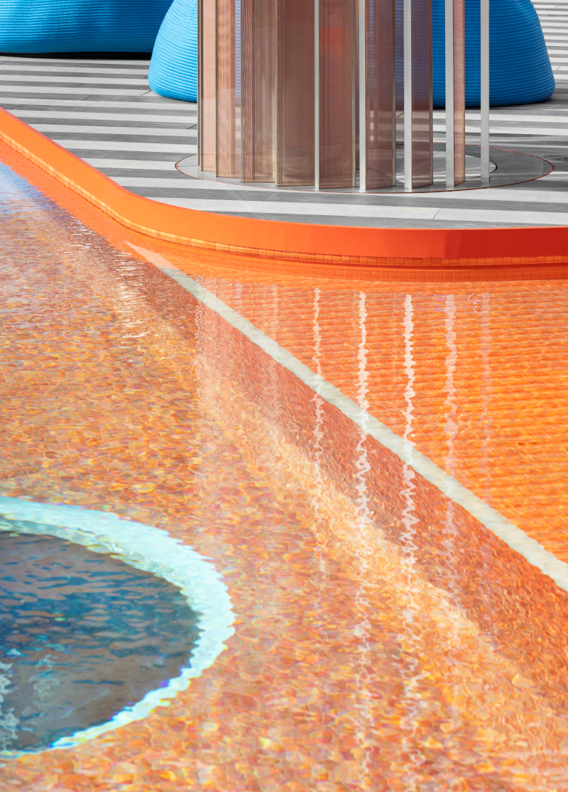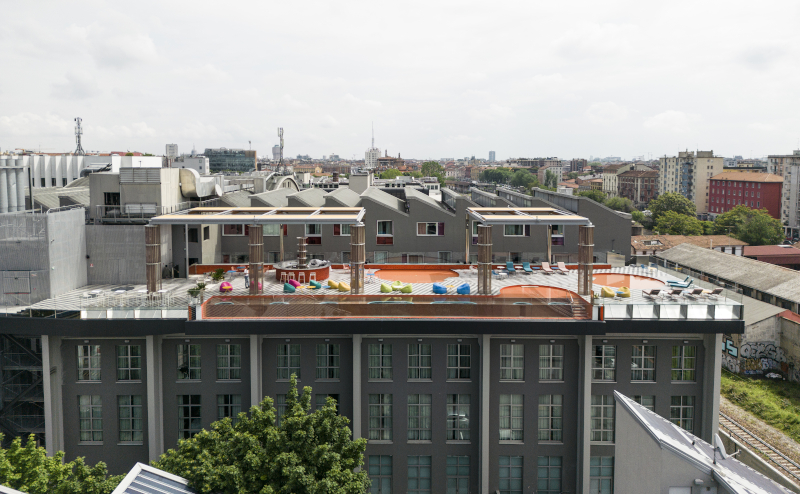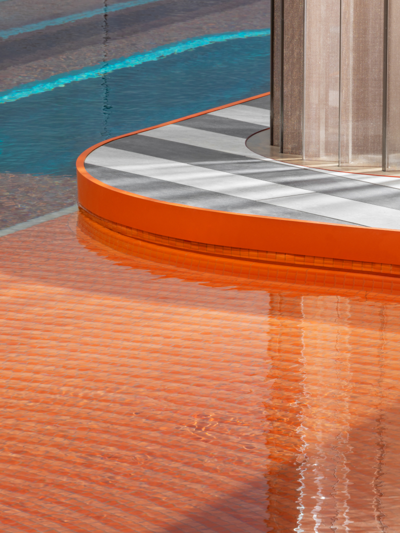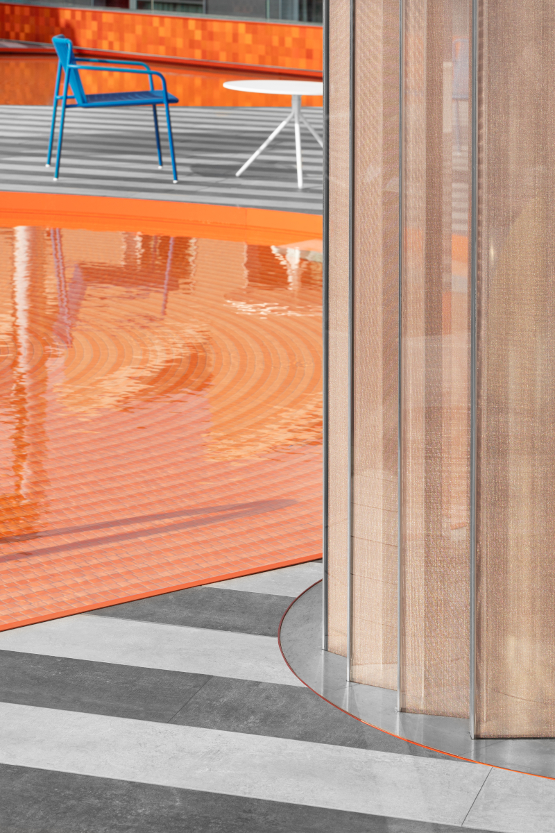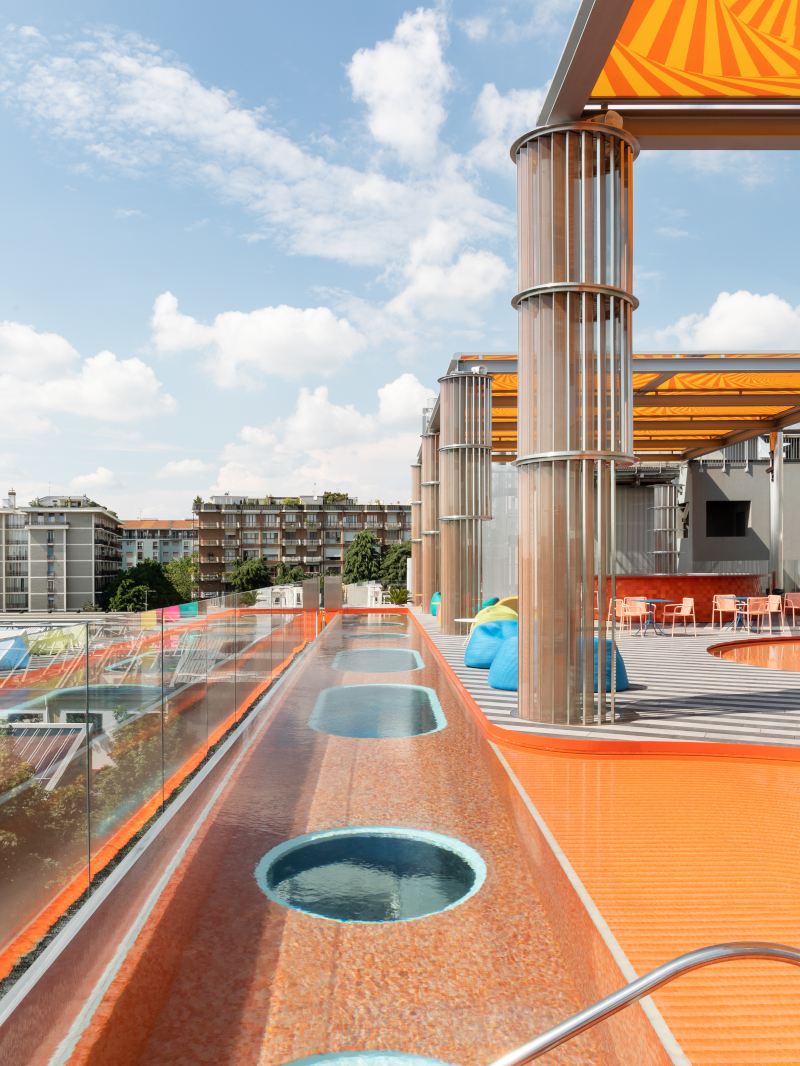 Un terrazzo con tre piscine dal forte impatto cromatico e percettivo, focalizzato sull'effetto esperienziale del visitatore ma che al tempo stesso si confronta con il contesto urbano in cui il progetto è collocato. In questo caso l'ex complesso industriale della General Electric costruito negli anni '20 in via Tortona.