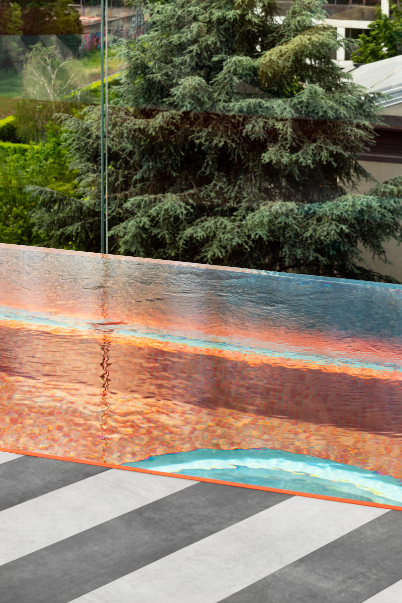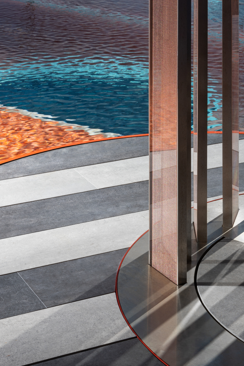 L'acqua diventa un elemento progettuale, intorno al quale gravita l'effetto 'vertigine', grazie alla piscina principale pensata completamente in aggetto rispetto al filo dell'edificio, con l'acqua contenuta da un'unica lastra verticale trasparente. Le altre due piscine circolari più piccole fungono da specchi d'acqua e all'occorrenza possono essere svuotate prestandosi ad avere funzioni e configurazioni diverse, quando il terrazzo da solarium diventa spazio per eventi, aperitivi, sfilate o altro.