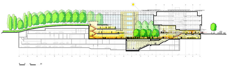 Nuova permeabilità e nuova accessibilità sono, dunque, le parole chiave, in un percorso che, tagliando il complesso longitudinalmente, offre un passaggio graduale dal caos della città al contatto con la natura del verde pensile.