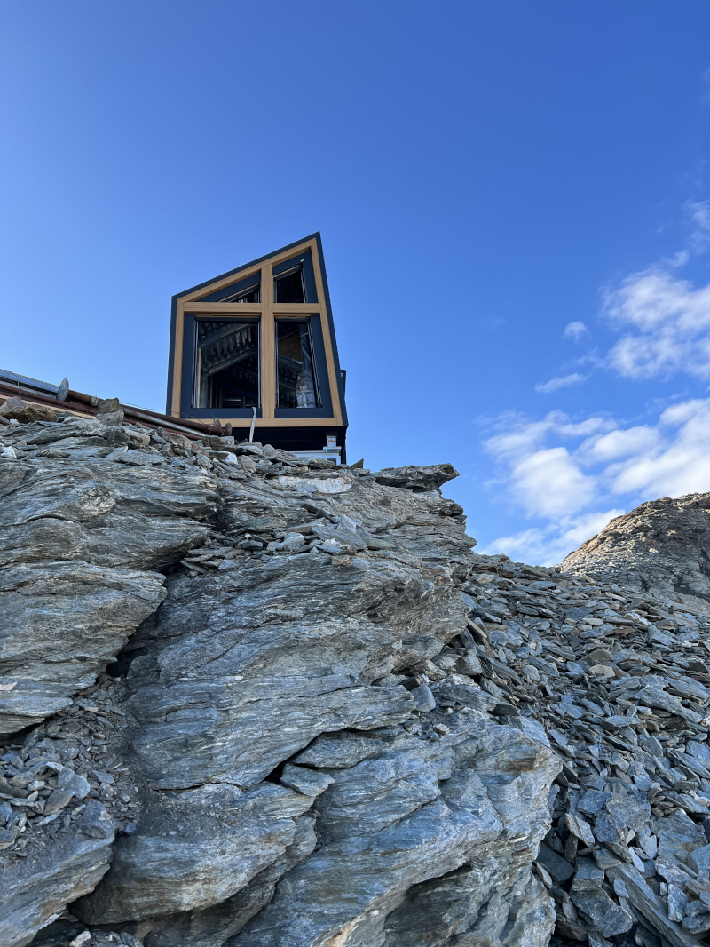 La struttura è stata studiata per essere prodotta in stabilimento, accoppiata e installata in quota, ed è il risultato di un percorso di ricerca che si è concentrato sulle soluzioni costruttive, per minimizzare i lavori da svolgere in quota, e sui materiali che devono ottimizzarne le prestazioni. Infatti, per realizzare i due blocchi che compongono il bivacco, è stato utilizzato un involucro prefabbricato ad alte prestazioni di isolamento, mentre il riscaldamento, previsto a pavimento, è progettato per garantire un comfort ottimale.