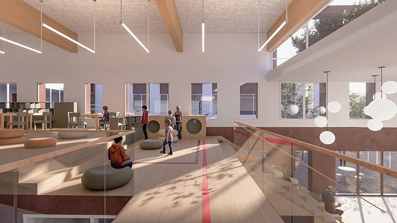 Il progetto si sviluppa attorno a due corti, la prima a destinazione prevalentemente pubblica con l'affaccio del civic center e dei laboratori, mentre l'altra - racchiusa tra le aule e caratterizzata dalla presenza di recinzioni permeabili - favorisce il dialogo tra spazi scolastici ed extrascolastici.