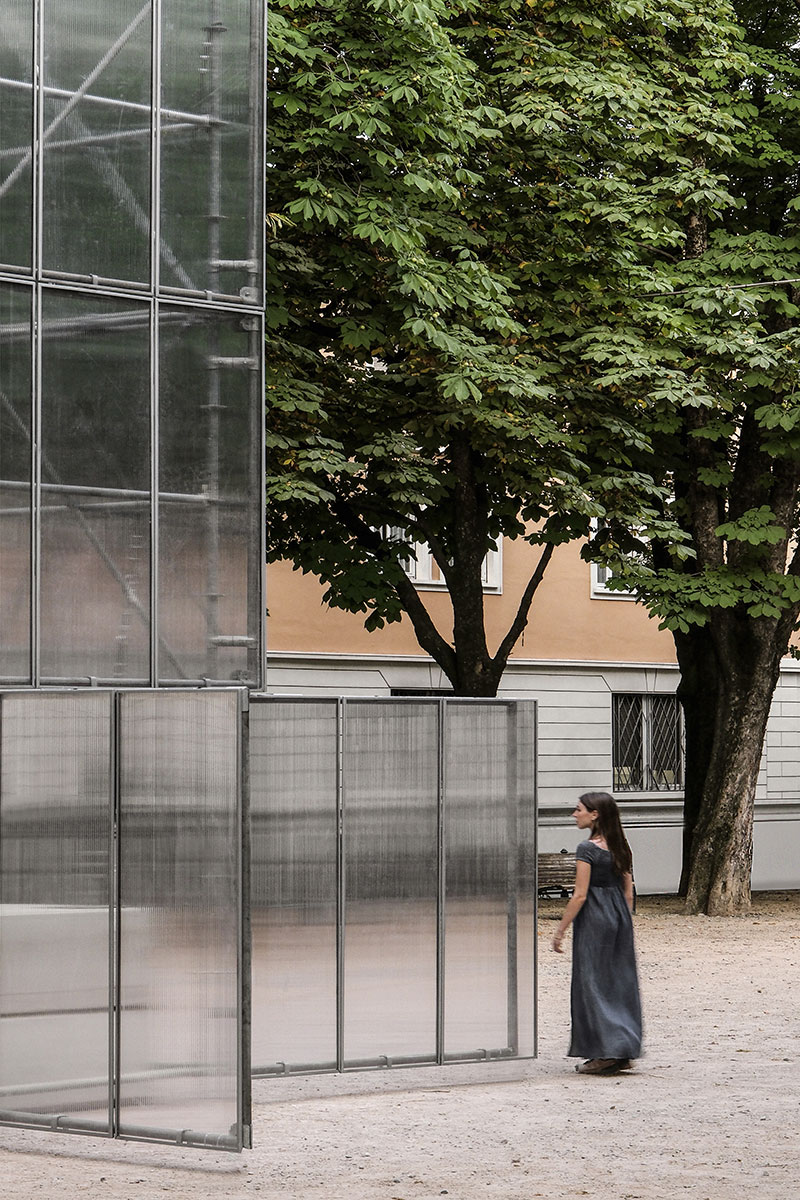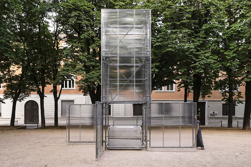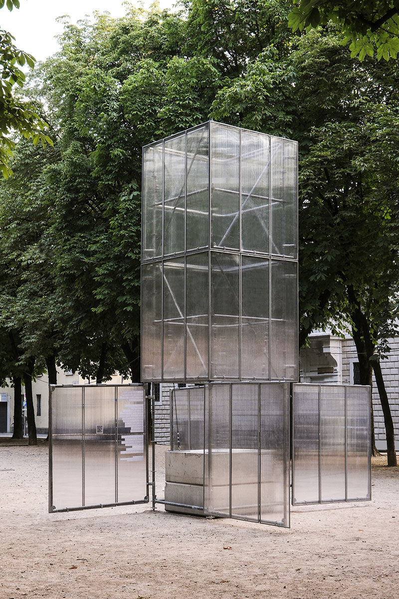 Realizzata in tubi innocenti, ferro zincato e policarbonato - per essere montata e smontata facilmente in più luoghi della città - quando è chiusa si configura come un landmark all'interno di piazza Tebaldo Brusato, mentre quando è aperta, annuncia l'accadere di qualcosa o di un'attività.