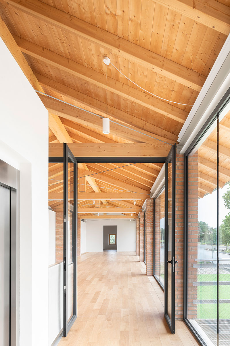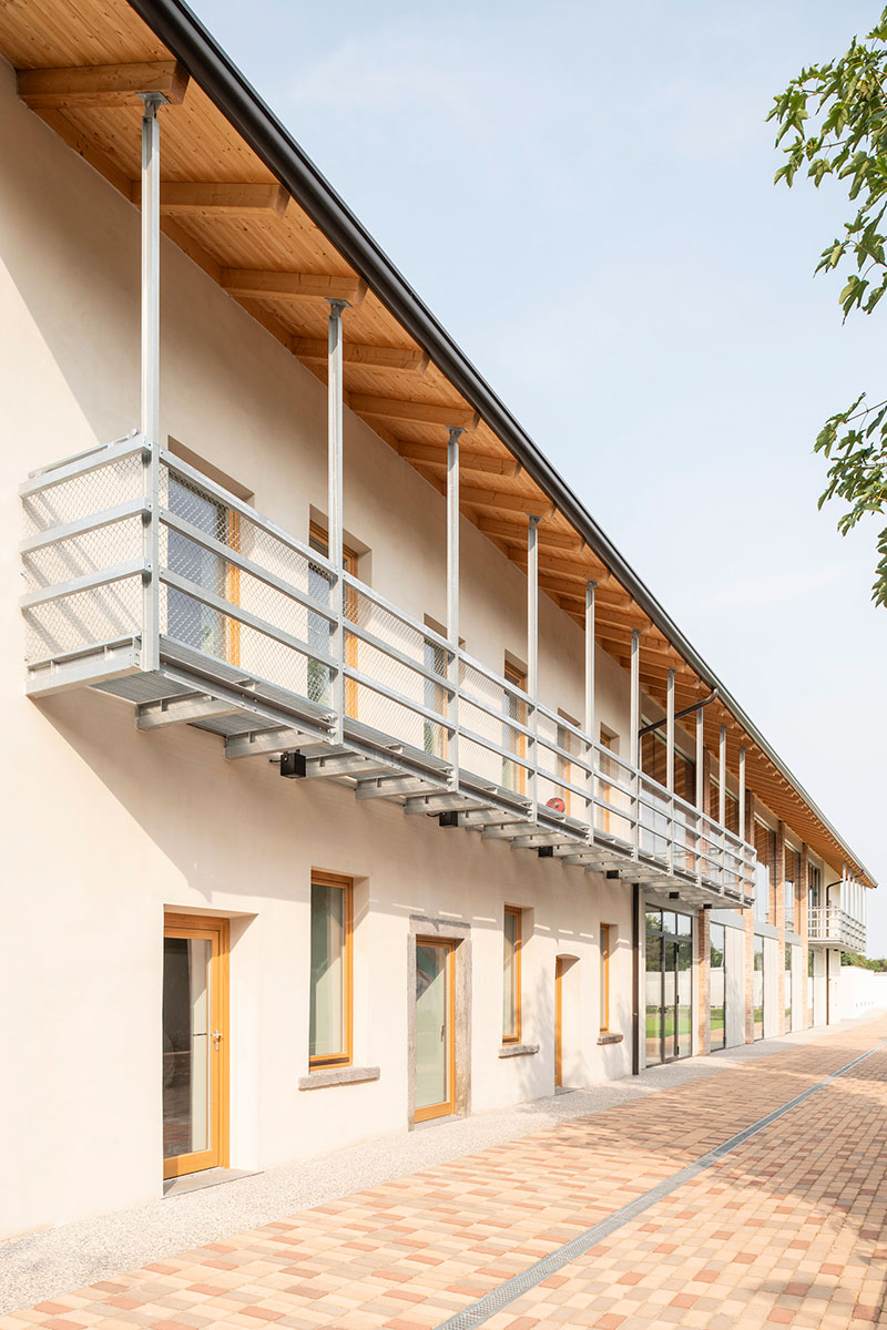 L'ex fienile, punto cardine dell'intervento, ospita al piano terra i laboratori, progettati secondo il principio di flessibilità per consentire lo svolgimento di più attività contemporaneamente, e al piano superiore una sala polifunzionale per attività sportive, eventi e spettacoli.