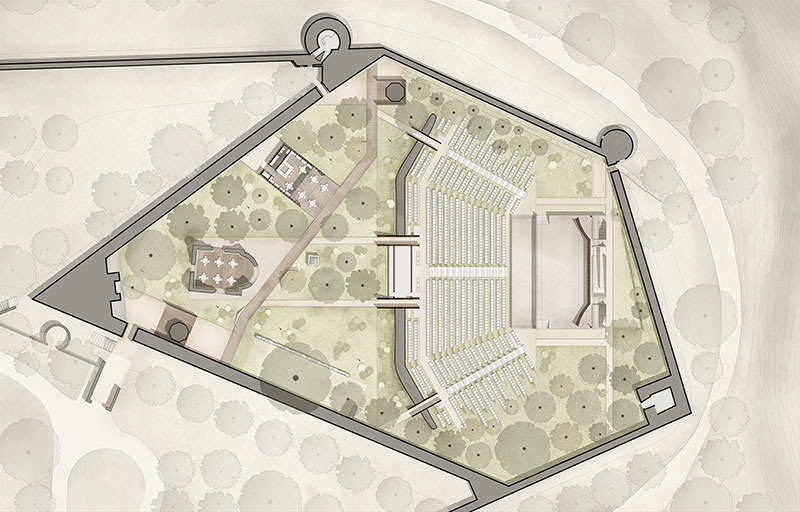 Attraverso l'utilizzo di una nuova pavimentazione drenante e la definizione dello spazio con l'introduzione di elementi di corten, l'ingresso principale dell'area viene completamente riqualificato. L'antica funzione di hortus conclusus si ritrova, invece, nelle linee principali dei percorsi e nella diversa vocazione degli spazi, creando due ambienti: il foyer alberato e il giardino teatrale, messi in contatto da un'area rialzata che è sia un elemento di separazione visiva, che di accesso e connessione all'arena.