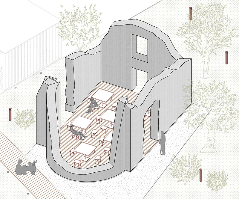 - il foyer alberato mostra un percorso realizzato in legno che funge da elemento di connessione tra gli elementi storici esistenti - come i ruderi della chiesa conservati e valorizzati attraverso la creazione di un deck in legno, rialzato e distaccato dal paramento murario da attrezzare con tavoli e sedute - e i nuovi interventi - tra cui la biglietteria e i servizi igienici, integrati da una nuova copertura in legno e il caffè book, realizzato ex novo.