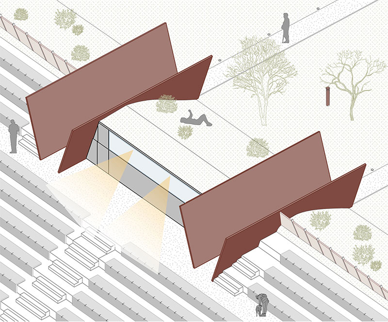 La fascia di connessione tra il foyer alberato e il giardino teatrale appare, quindi, come dispositivo percettivo che separa i due spazi attraverso il movimento del terreno, definendo gli accessi all'arena grazie a delle "lame metalliche" che indirizzano fisicamente e visivamente lo spettatore, mitigando al tempo stesso il disturbo acustico.