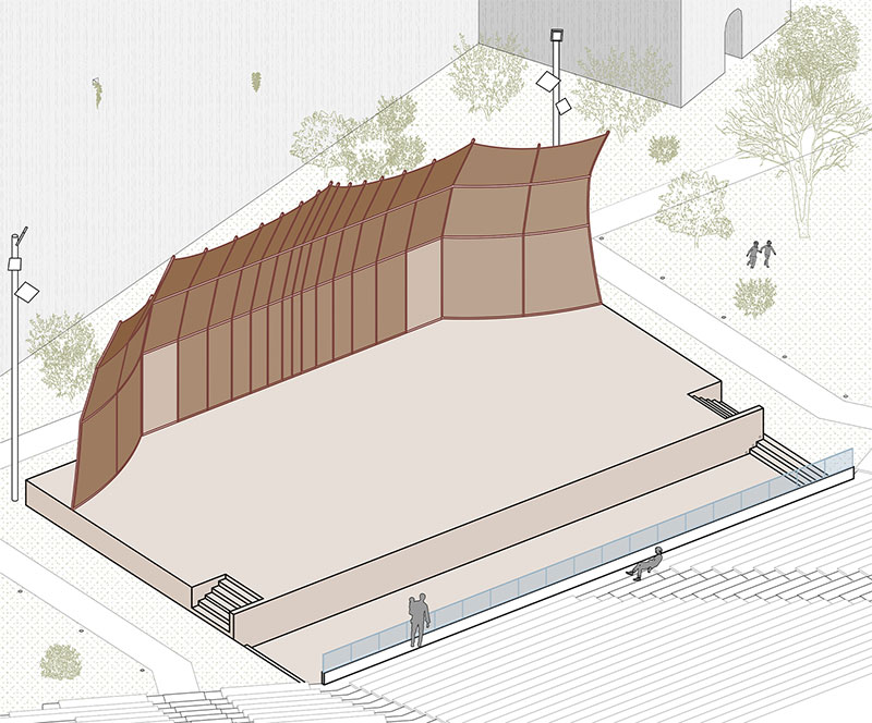 La nuova arena segue il naturale andamento del terreno e dà luogo a una gradinata quasi naturale adatta ad ospitare 1175 posti (di cui 6 per disabili), da realizzare con terra stabilizzata drenante con sedute in blocchi di pietra locale, che si inseriscono nel terreno, creando una relazione continua tra componente vegetale e minerale.