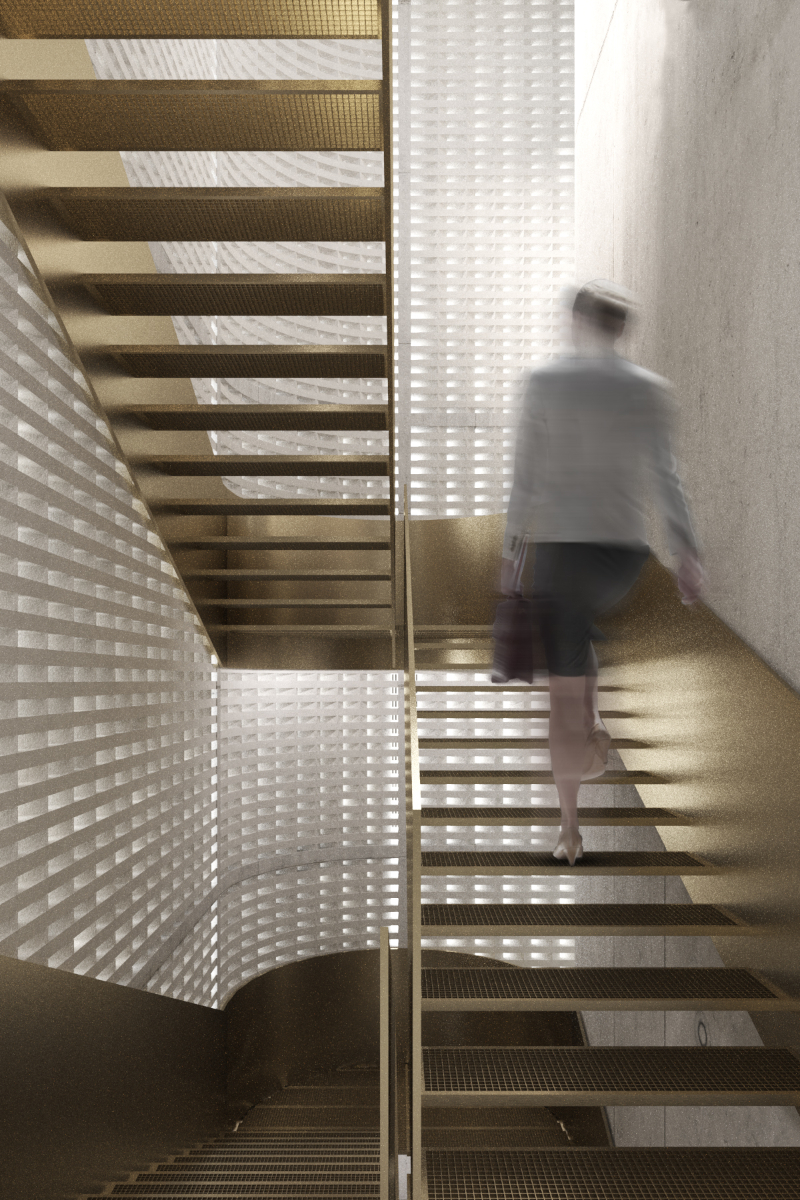 Il progetto prevede il mantenimento dell'attuale distribuzione verticale: le tre scale esistenti saranno interamente conservate e affiancate da due nuovi ascensori, mentre, per motivi di sicurezza antincendio, verranno inserite quattro nuove scale esterne di emergenza.