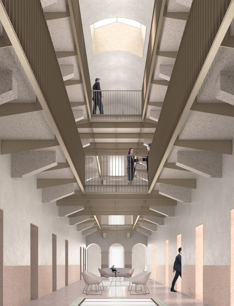 Il primo e il secondo piano saranno occupati dal Tribunale Ordinario. Il terzo piano, in origine un sottotetto disabitato, ospiterà le unità di trattamento aria, mentre l'ala est sarà ridisegnata da uno spazio multifunzionale comune, grazie alla sostituzione di alcune capriate esistenti con nuove travi sagomate ad arco in legno lamellare e all'apertura di lucernari.