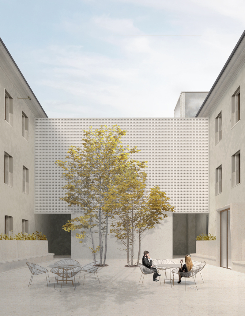 «La definizione della materialità dei vani scala è stata altrettanto importante per far dialogare il vecchio e il nuovo», aggiunge Segantini. «I vani scala - prosegue - sono in laterizio vetrificato in equilibrio cromatico con l'edificio esistente. I mattoni sono stratificati in modo da creare una trama di luce e cambiano ogni singolo momento della giornata». «Un parapetto strutturale in acciaio - conclude - definisce le rampe con un materiale simile a quello dei balconi, per stabilire un dialogo con la pietra, materiale molto utilizzato nell'ex carcere».