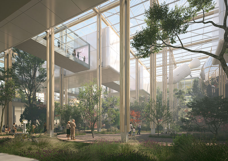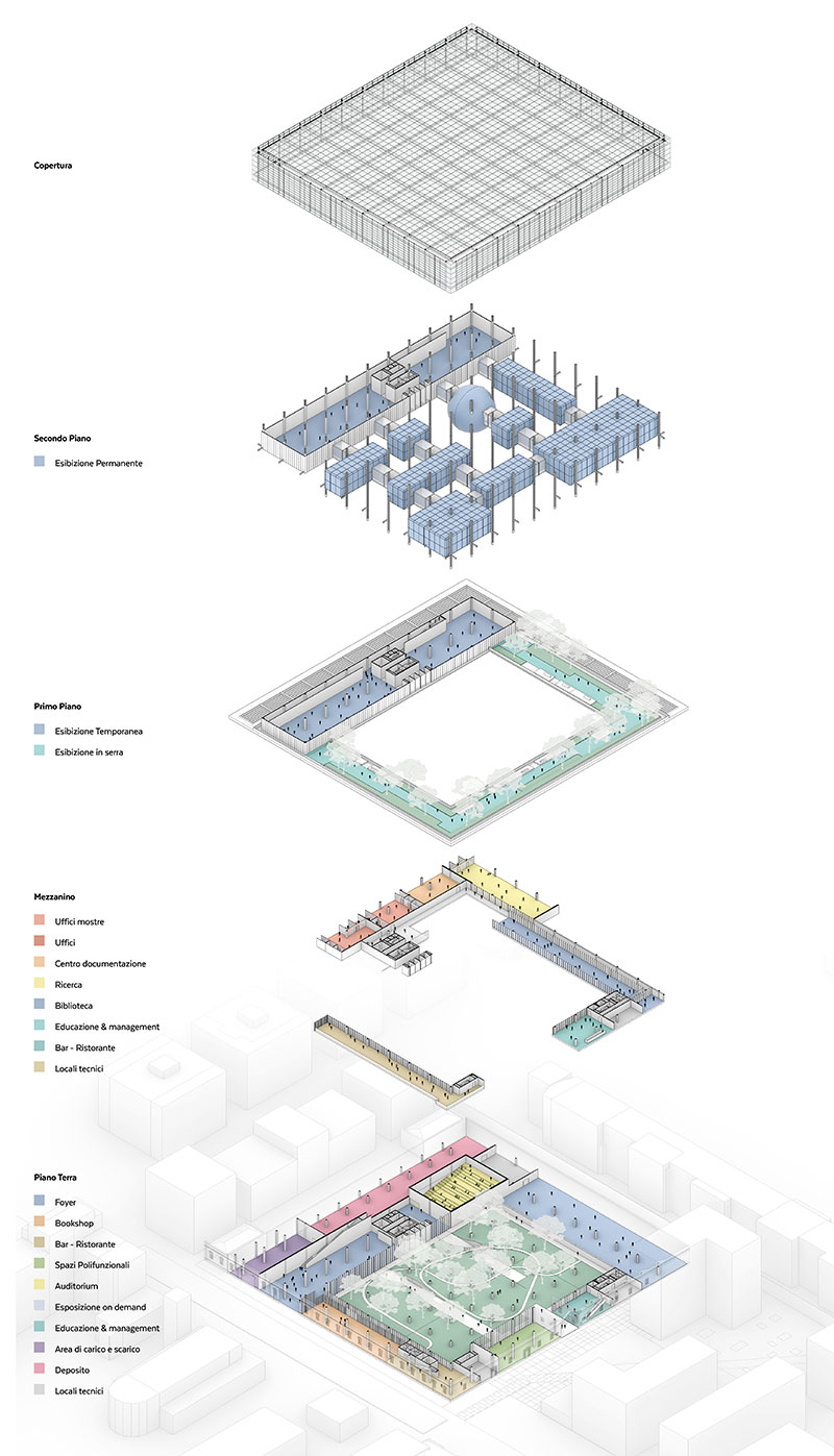 Il piano terra sarà interamente accessibile e caratterizzato dalla presenza del verde diffuso che, insieme a foyer a doppia altezza, caffetteria, bookshop e ristorante, creerà un luogo adatto ad ospitare diverse attività, dagli allestimenti agli incontri dedicati alla scienza, a conferma del ruolo culturale e sociale del museo.