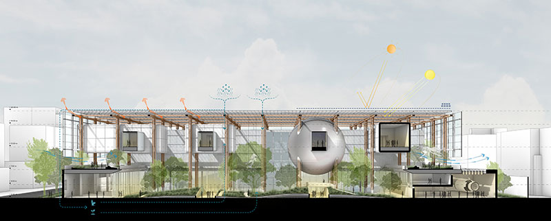 Sospese sul parco, sostenute da una struttura in legno e acciaio come una selva di alberi artificiali e connesse tra loro da corridoi vetrati, le capsule di diverse geometrie e dimensioni enfatizzeranno la relazione tra naturale e artificiale, protette da una teca semi-trasparente aperta per consentire la ventilazione naturale e l'effetto camino e dalla copertura completamente rivestita da celle fotovoltaiche per garantire all'edificio la produzione di energia elettrica.
