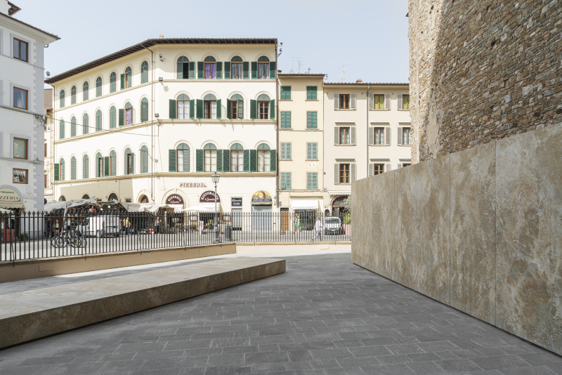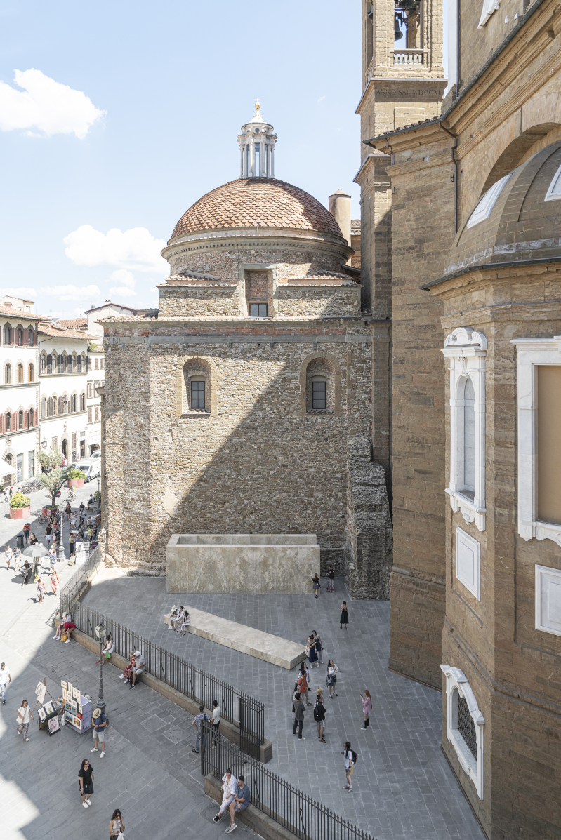 Qui sono visibili solo due elementi: il blocco parallelepipedo che perimetra e protegge la scala e la seduta posta al centro della piazza. Un'urna a dimensione urbana, così viene definita dai progettisti la configurazione urbana del progetto, che allude alla memoria, sempre viva, che San Lorenzo custodisce e trasmette attraverso la chiesa, la Biblioteca laurenziana e le tombe. Due le opere d'arte prese come riferimento: il Giudizio universale di Beato Angelico e la Resurrezione di Piero della Francesca. Entrambe «vincolano la morte alla vita, al suo continuo riformarsi e riprodursi. Tale è il senso più profondo del museo», spiegavano i progettisti nella relazione di progetto.