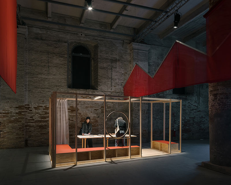 Lo spazio delle Corderie si trasforma, così, in una forma di aggregazione collettiva, costruendo fisicamente un luogo di incontro sia formale che informale costituito da frammenti: una gradonata, un muro dipinto e un campo da gioco, un Tavolo dei Tavoli, alcuni arredi.
