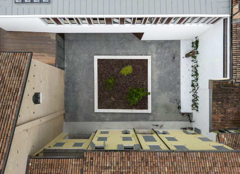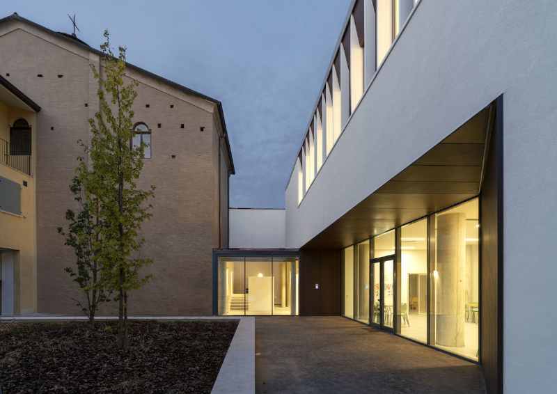 «L'intervento - spiega ancora lo studio - ha previsto la demolizione parziale delle strutture esistenti e la ricostruzione di un nuovo edificio: un volume leggero e vetrato, molto compatto, sviluppato su due piani nel rispetto delle altezze del contesto. Il nuovo volume diventa l'occasione per dar vita a una serie di cortili destinati a creare nuove relazioni spaziali tra la chiesa di San Rocco e il centro parrocchiale, e a favorire le connessioni tra la parte pubblica a ovest, e la parte privata a est, dove è stata collocata la casa canonica».