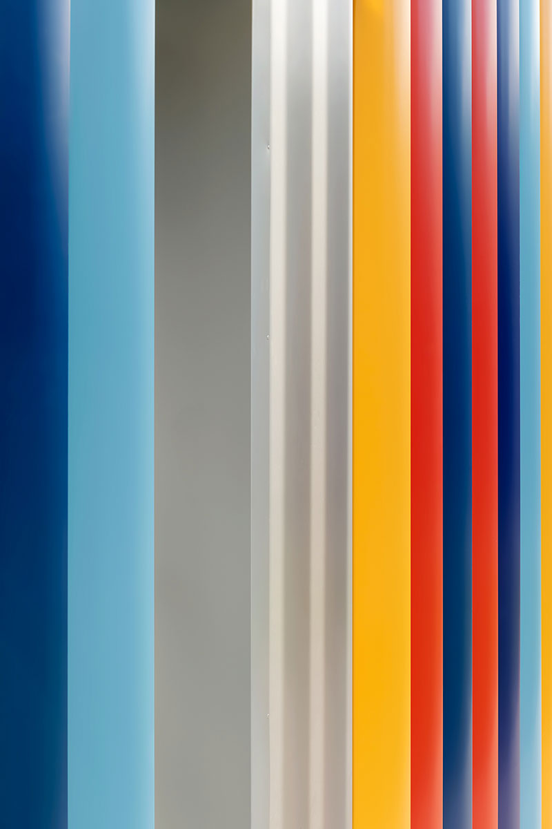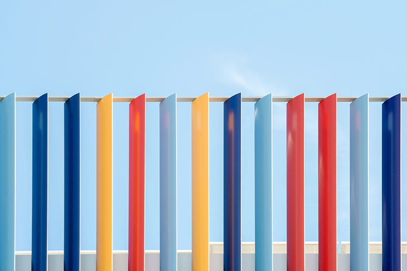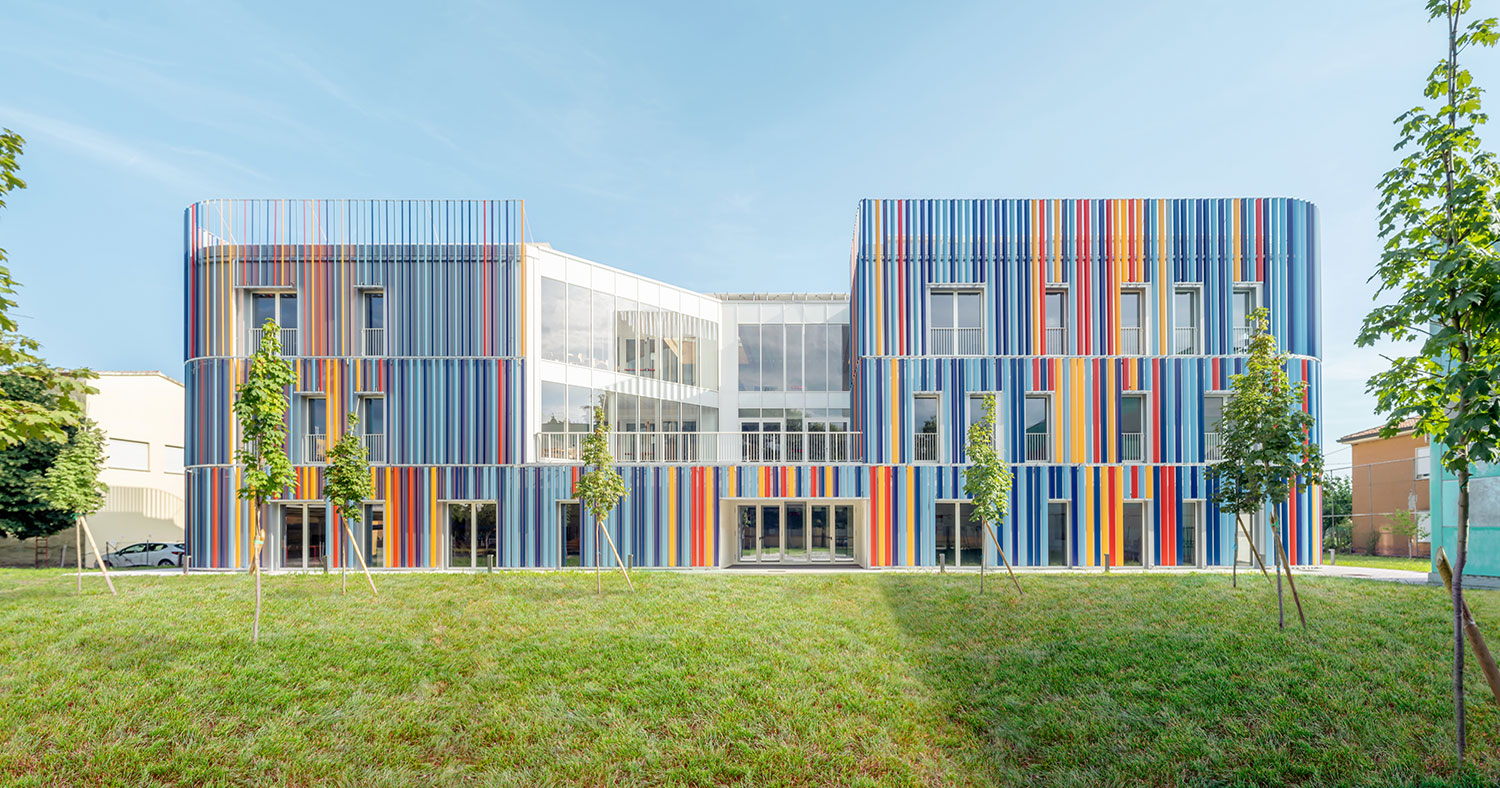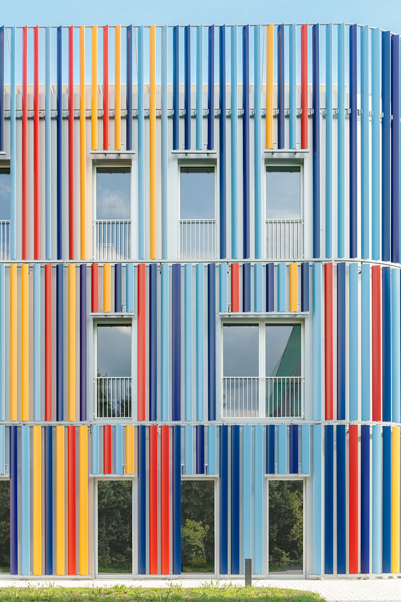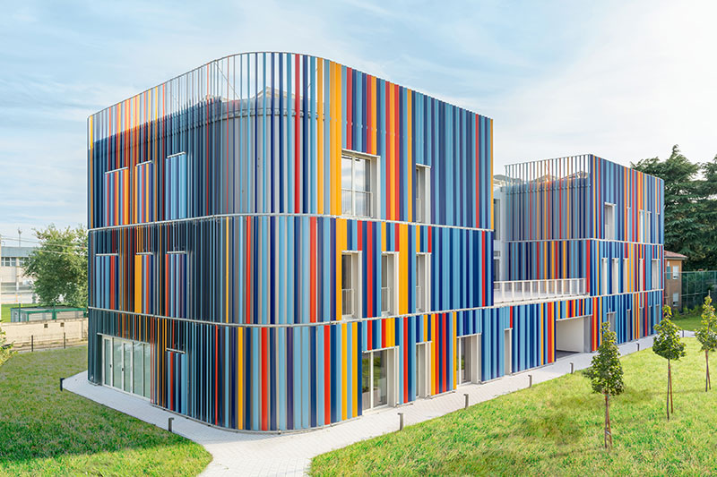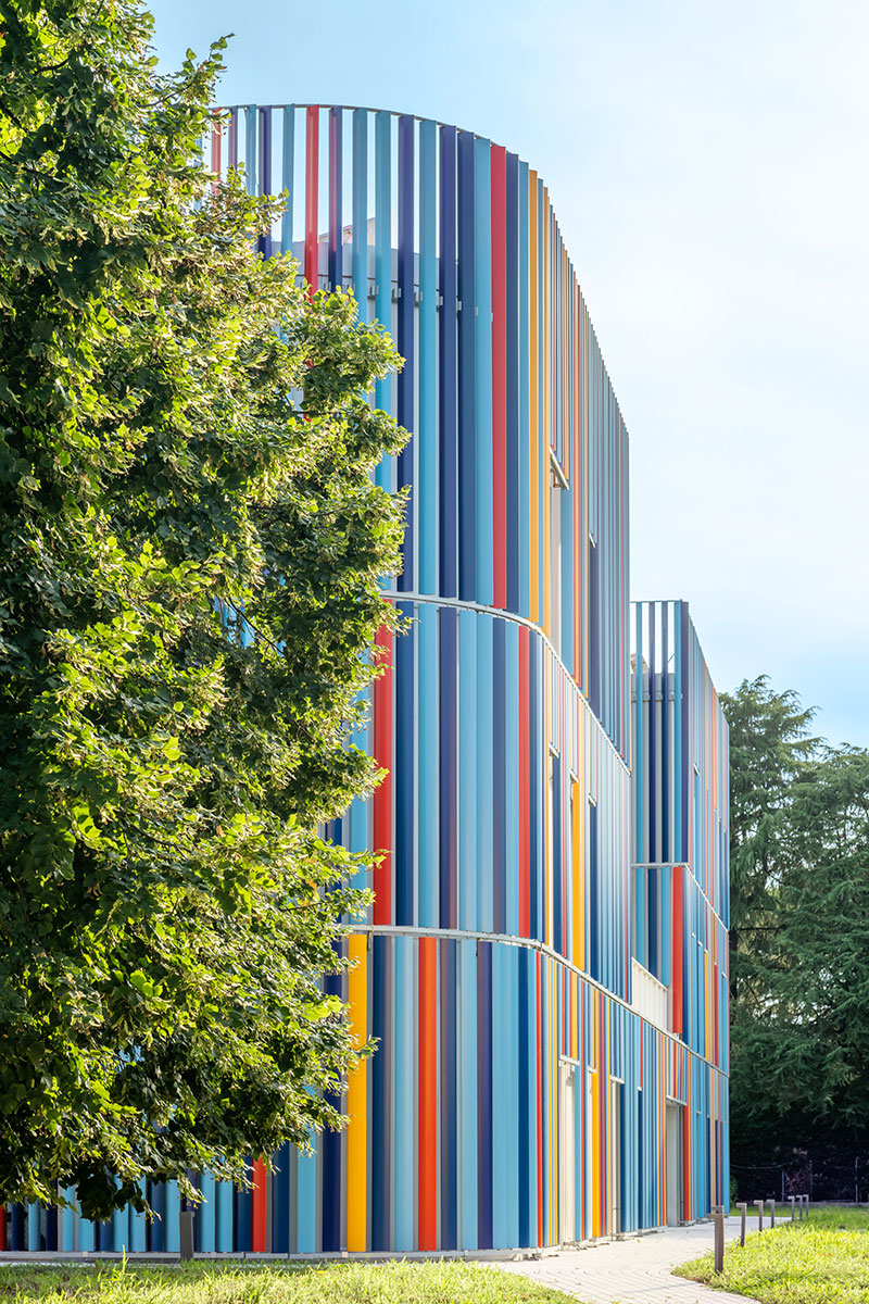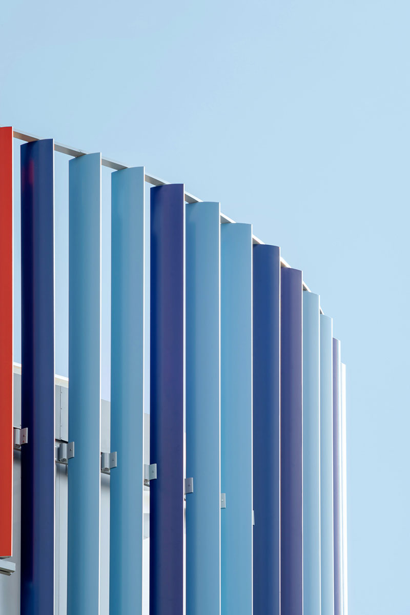 Oltre ai criteri di sostenibilità e massima efficienza energetica - con l'ambizione del raggiungimento della classificazione nZEB e la progettazione orientata secondo i principi del protocollo LEED© - a caratterizzare la struttura è proprio il sistema frangisole a lamelle verticali, composto da pale in lamiera di alluminio pressopiegata preverniciata in colori accesi.