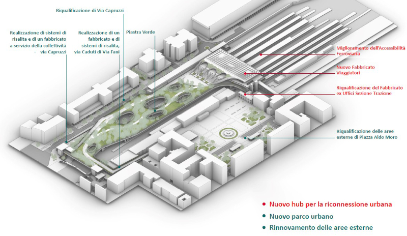 Anche le aree esterne di piazza Aldo Moro saranno riqualificate: è prevista la pedonalizzazione di una parte dell'invaso (quella a sud prossima all'ingresso di stazione) previa razionalizzazione dei flussi intermodali. L'area nord della piazza vede confermata la prevalente destinazione a verde pubblico, che sarà potenziata. L'ampio programma comprende anche interventi su via Capruzzi (la strada che corre parallela al fascio di binari) con l'ampliamento delle superfici pedonali, la razionalizzazione di spazi e percorsi pubblici, l'aumento delle dotazioni pubbliche in termini di verde urbano, di infrastrutture intermodali e di potenziamento di percorsi ciclopedonali.